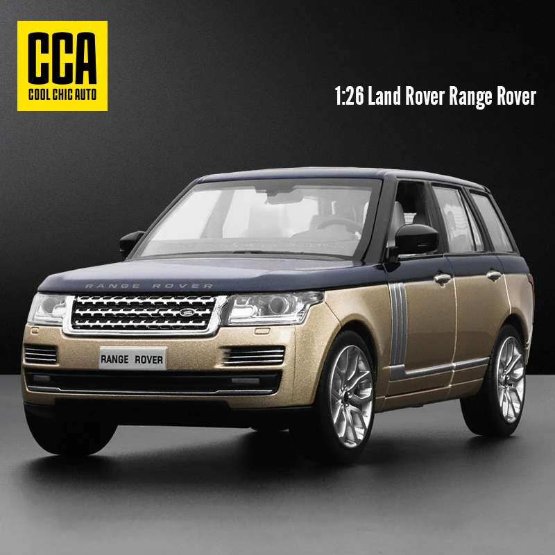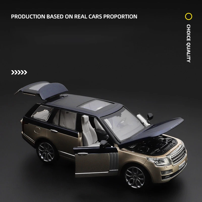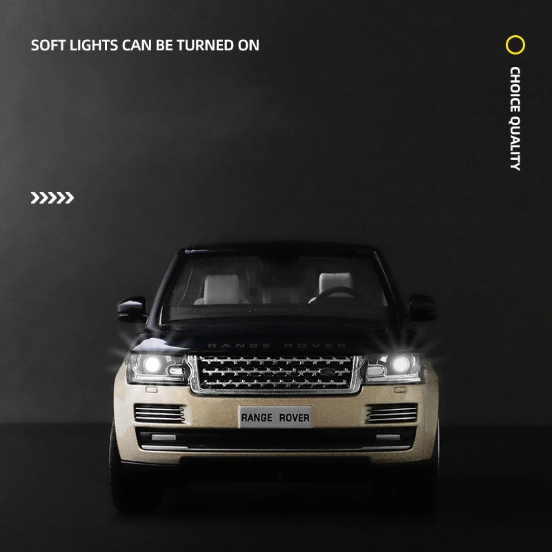 Experience the realism and craftsmanship of this this 1:26 scale Land Rover Range Rover Sport alloy car model, perfect for displaying or gifting. Its striking metallic gold finish, complemented by a sleek black roof and side mirrors, creates a sophisticated two-tone design that captures attention. The model features smooth, contoured body lines, detailed silver grille with lattice patterns, and clear headlamp assemblies, offering a stunning visual impact. Chrome-like accents around the windows and multi-spoke alloy wheels enhance its luxurious appearance. The transparent windows reveal hints of interior detail, making it an ideal collectible for enthusiasts. Its compact size and true-to-life design make it an elegant addition to any collection or display setting, celebrating automotive excellence with style and precision.