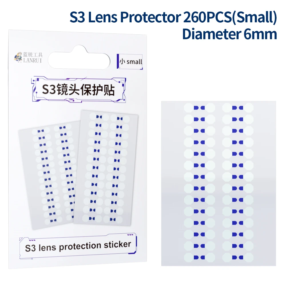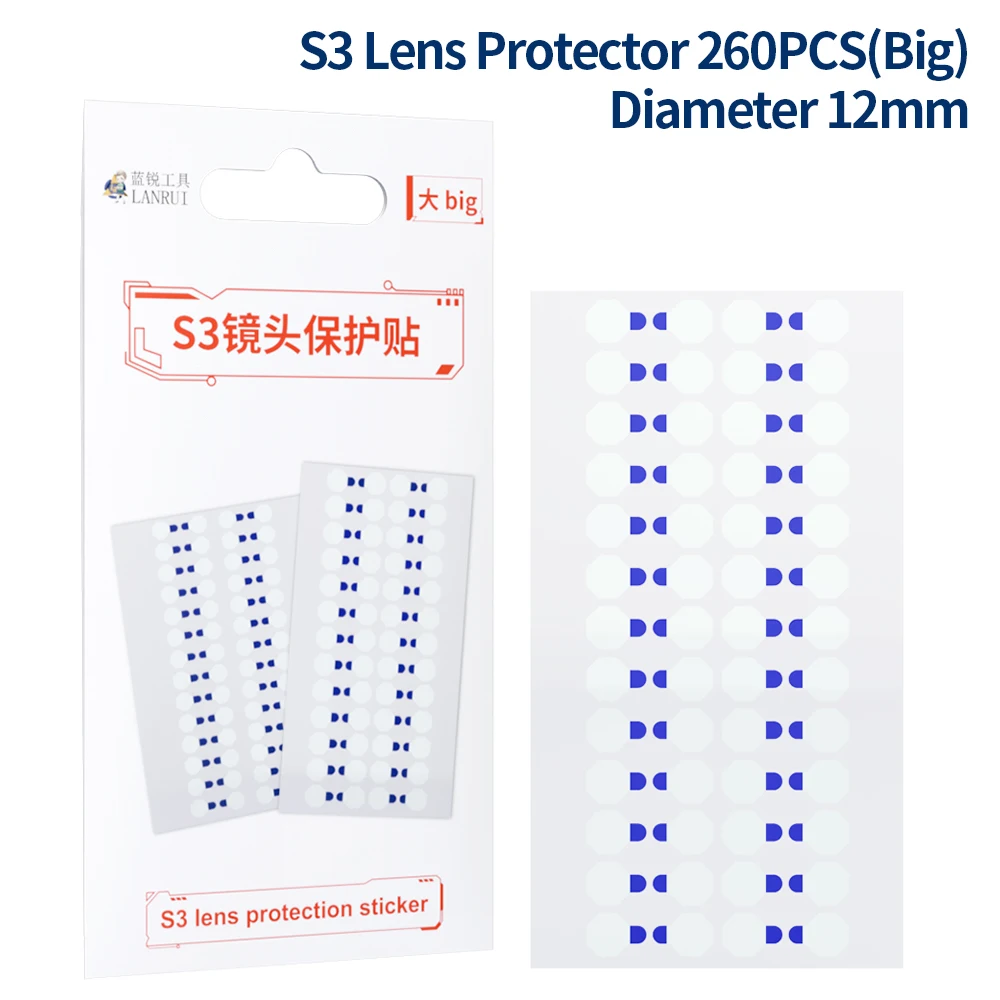 This set of LANRUI S3 Lens Protectors includes two sizes: a 12mm diameter protector for main camera lenses weighing 30.1 grams and measuring 220×115mm, and a 6mm diameter protector for secondary lenses weighing 12.9 grams and measuring 140×85mm. Made from high-temperature resistant material, these protectors withstand repair heat without warping or losing adhesion. They feature anti-mistouch safety to prevent fingerprints and scratches, and offer dust and scratch resistance with an opaque film coating that keeps lenses clean and clear. Designed for universal compatibility, they provide full coverage without misalignment, ensuring reliable protection for your mobile phone camera lenses during repairs and daily use.