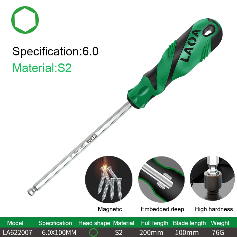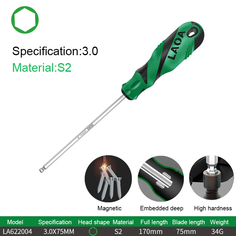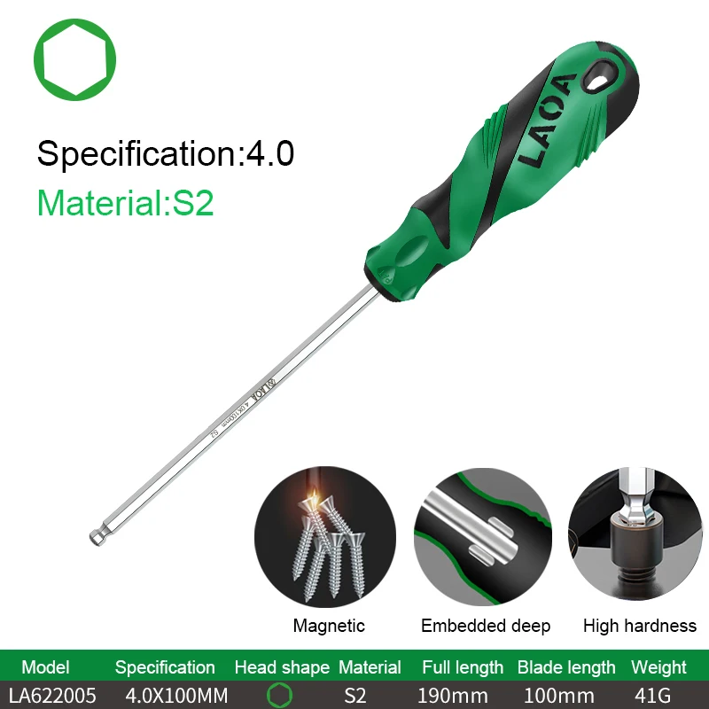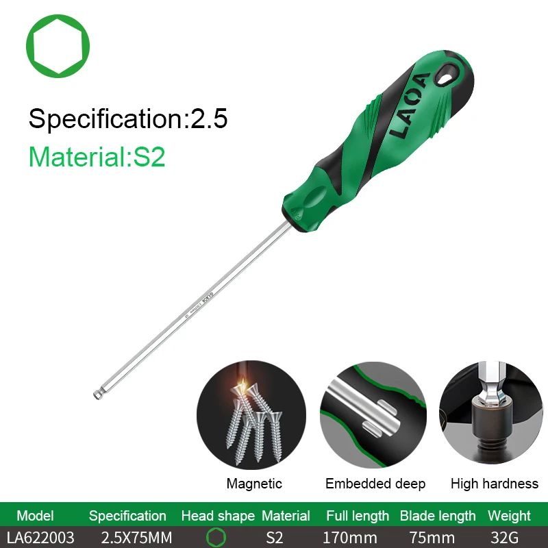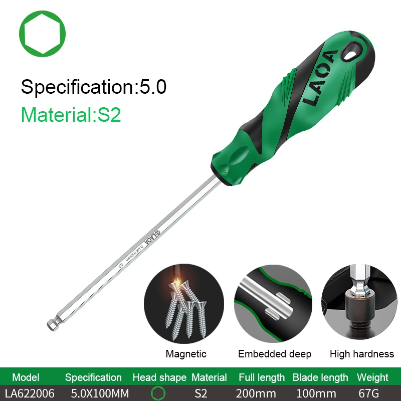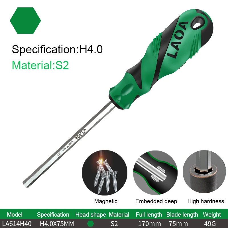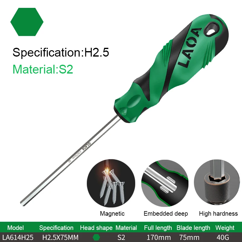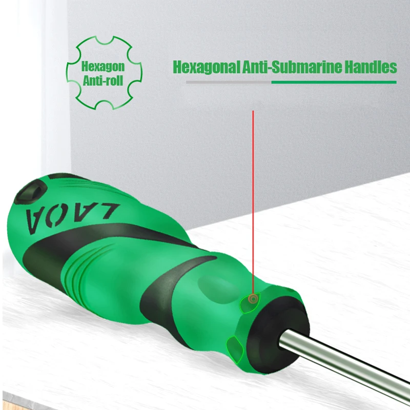 Elevate your toolkit with the LAOA magnetic screwdriver set, crafted from high-quality alloy steel with an impressive HRC hardness of 58. This versatile set includes various models: LA622001 (1.5x75MM), LA622002 (2x75MM), LA622003 (2.5x75MM), LA622004 (3x75MM), LA622005 (4x100MM), LA622006 (5x100MM), LA622007 (6x100MM), LA614H15 (H1.5×60), LA614H20 (H2.0x60), LA614H25 (H2.5×60), LA614H30 (H3.0x75), and LA614H40 (H4.0x75). Each screwdriver features a non-slip ergonomic handle for enhanced comfort and grip, along with hexagonal heads designed for multifunctionality and secure screw retention. Achieve precision with these quality tools that make every project easier.