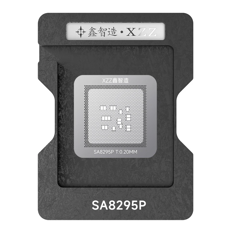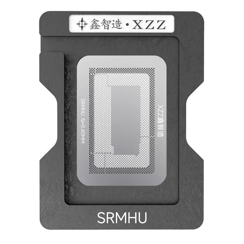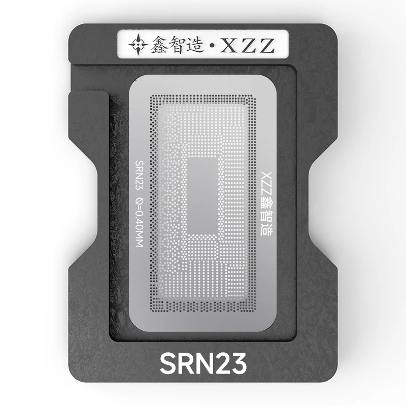 This high-quality BGA reballing stencil is designed for professional CPU repair and reballing tasks. Crafted to ensure accuracy, it features a sleek, functional black frame with detailed grid patterns of small, evenly spaced holes. These patterns are tailored to fit specific laptop CPU models like SRL2Y, SRMHU, SRN23, and SA8295P, making your reflow work precise and efficient. The stencil's minimalist design emphasizes durability and ease of use, while the contrasting black and white markings guarantee clear identification. Its universal base, with embossed star-shaped patterns and gentle blue Chinese characters, provides a stable platform for precise tin planting or reballing work. Trust this stencil to streamline your repair process with optimal technical excellence.