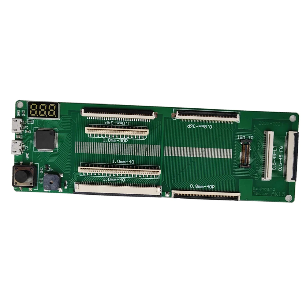 The Laptop Keyboard Tester is an indispensable tool for anyone needing to assess laptop keyboards' functionality. Featuring a bright green printed circuit board (PCB), this compact device is designed for handheld use, making it convenient to carry. The tester has various labeled connector slots, ensuring compatibility with all laptop brands, including Acer. With a digital display for easy reading and simple operational buttons, it's user-friendly. Accompanied by a standard blue USB cable, the tester provides a reliable connection for quick set-up and testing. This straightforward tool streamlines keyboard replacement tasks, ensuring that your experience is efficient and hassle-free.