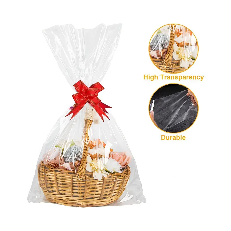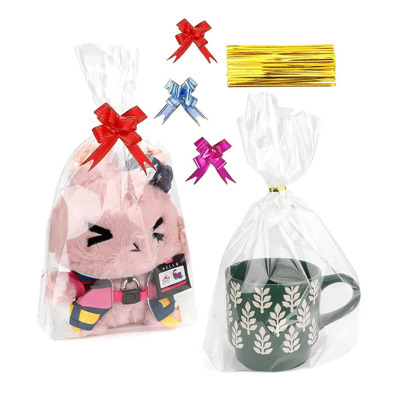 Elevate your gift presentation with these large, glossy cellophane gift bags available in sizes ranging from 20x30cm to 60x90cm. Sold in packs of 20 or 30 pieces, each bag features a transparent design accented with vibrant, colorful bows and decorative kinks, creating a cheerful, festive look. Made from durable plastic, these versatile bags are perfect for birthdays, weddings, parties, holidays, and special occasions. The crisp rectangular shape and lively colors make your gifts stand out beautifully, while their customizable nature ensures they adapt to various themes and needs. Trust these eye-catching, high-quality bags to add a polished finish to your special presentations.