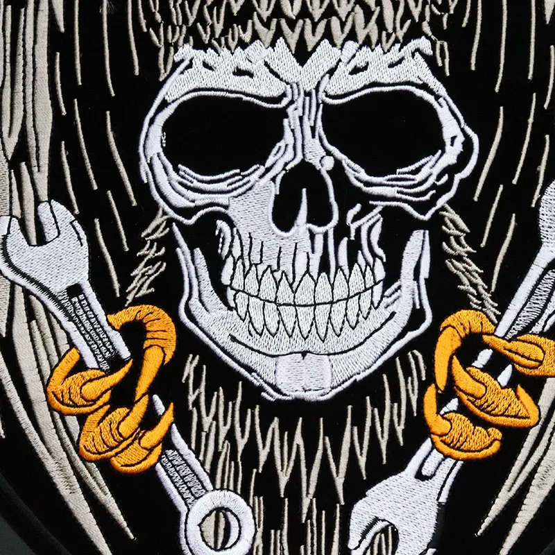 - Two silver wrenches flanking the skull, adding mechanical flair.