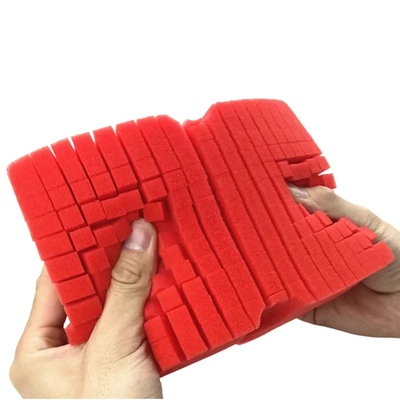 Imagine effortlessly maintaining your car's shine with this large, vivid red car washing sponge. Crafted from high-density foam, its soft yet durable surface ensures gentle cleaning, preventing scratches while delivering excellent water absorption. The cross-cut textured design creates tiny square and rectangular segments, increasing efficiency in cleaning wheels, tires, rims, and chrome surfaces. Ergonomically designed indents on the sides ensure a firm grip, reducing slips during use, even when wet. With dimensions of approximately 18cm x 12.7cm x 7.6cm, this jumbo-sized sponge offers ample coverage, making car care more convenient. Its super absorbent cell structure holds up to 700 ml of liquid, allowing extended cleaning sessions. Perfect for both professional detailers and home enthusiasts.