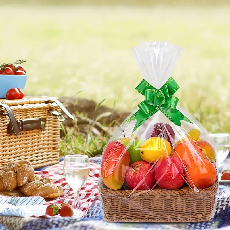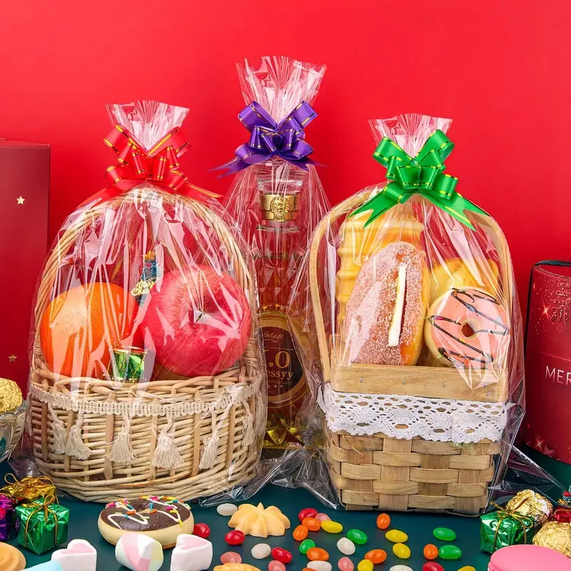Elevate your gift presentation with these large, clear cellophane bags available in 20 or 50 pieces. Crafted from durable paperboard, each bag measures 43x56cm, 35x50cm, 60x75cm, or 20x30cm, perfect for wrapping baskets, gifts, and party favors for any occasion, including Christmas, weddings, birthdays, and graduations. The glossy transparent material showcases your contents beautifully, while a decorative bow at the top adds a festive and elegant touch. These versatile, chemical-free bags are ideal for creating memorable gift displays that are both safe and visually appealing, helping you impress your friends, family, or clients effortlessly.