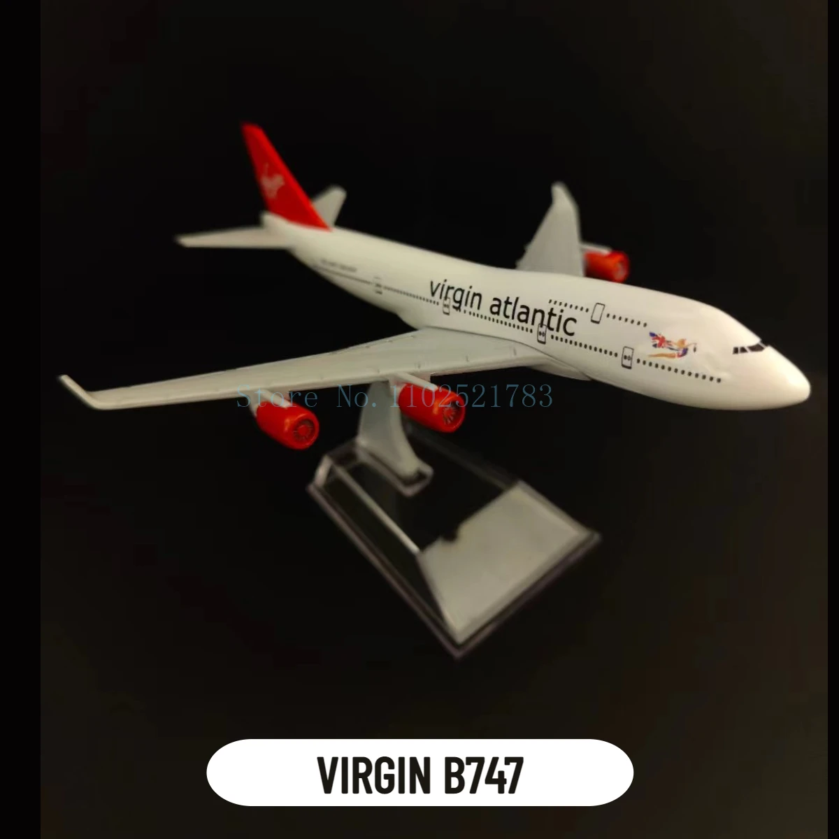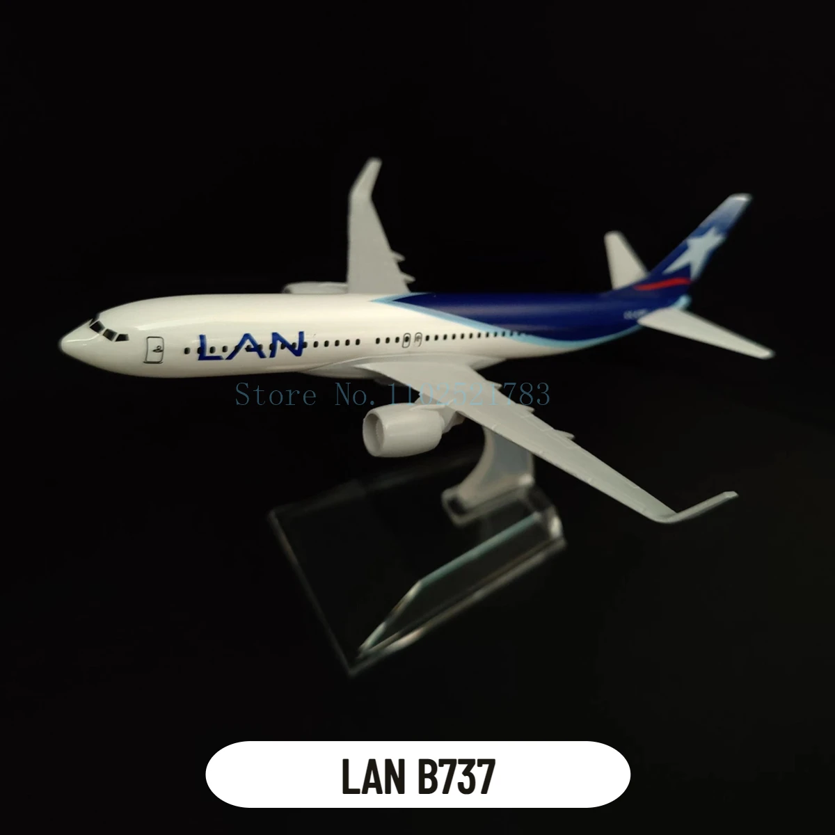 - Striking tail design with a dark blue vertical stabilizer adorned with red and white accents to bring vibrant contrast to the model.