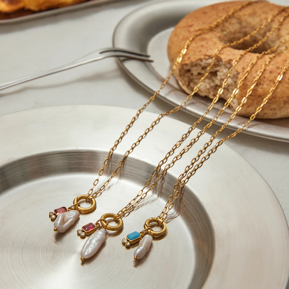 - Includes two circular gold rings, each with a dangling freshwater pearl, along with colorful zircon stones—deep red and deep blue—set in gold frames for vibrant contrast.