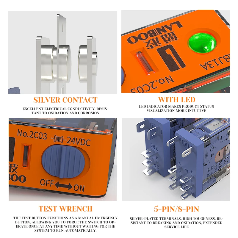 - The relay features a 5-pin or 8-pin configuration with an integral base supporting various models including 2NO2NC and 1NO1NC types, ensuring versatility for different applications.
