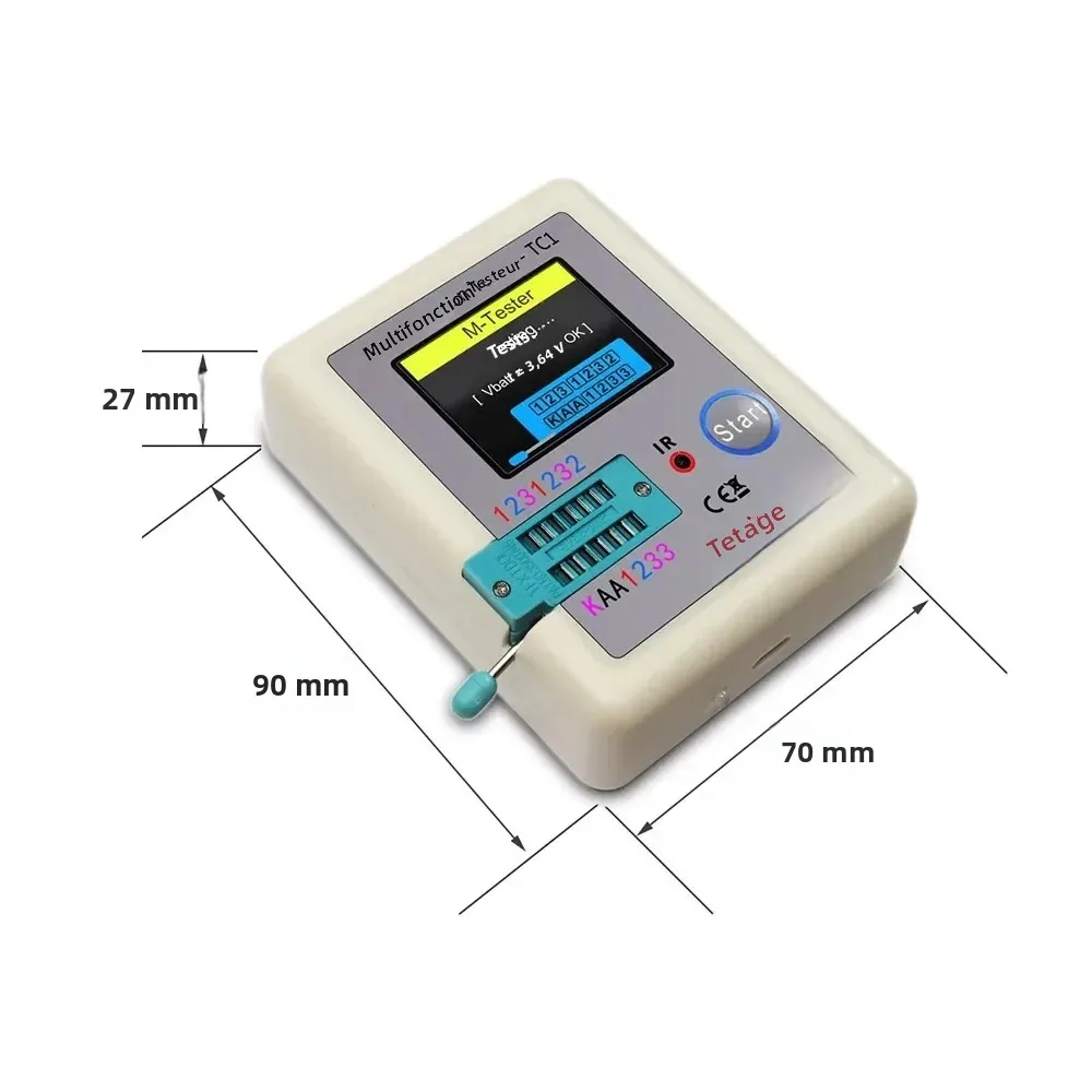 The LCR TC1 Transistor Tester is a versatile tool designed for electronic enthusiasts, featuring a 1.8″ TFT LCD display and compact dimensions of 70*90*28mm. Powered by a rechargeable 3.7V lithium battery with USB charging, it measures capacitance (25pF-100mF), inductance (0.01mH-20H), and resistance (0.01-50MΩ). This device efficiently detects NPN and PNP transistors, diodes, triodes, N-channel and P-channel MOSFETs, and Zener diodes, with a diode range of <4.5V and a Zener diode testing area of 0.01-20V. Its auto range operating mode ensures ease of use within a temperature range of 0-40℃.