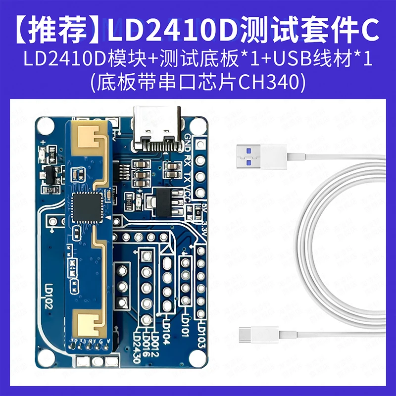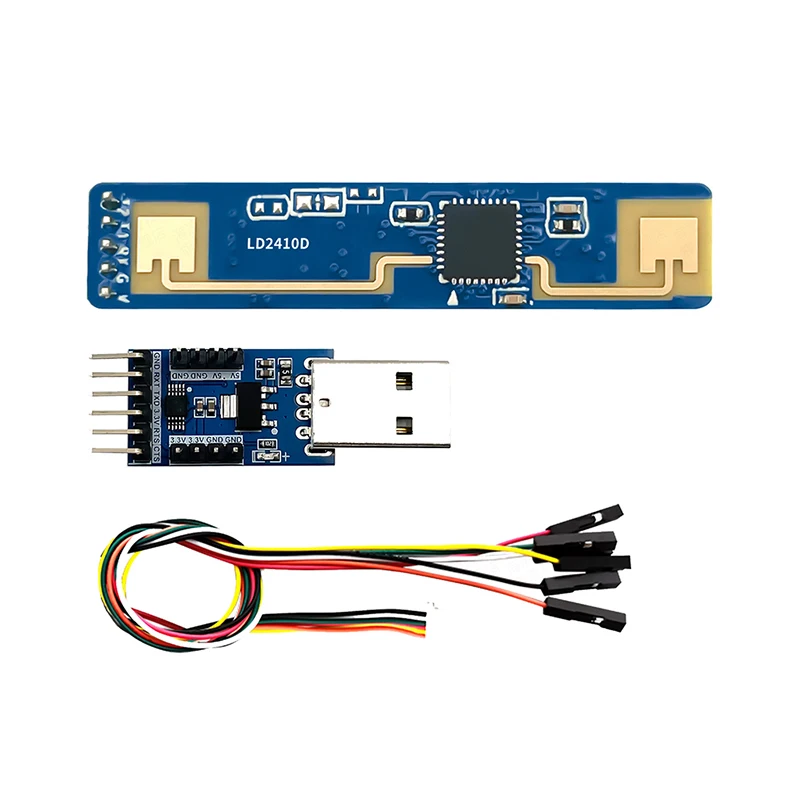 Experience seamless human detection with this compact LD2410D module, designed for reliable indoor sensing applications. Its sleek, rectangular blue circuit board features crisp white silkscreen markings, highlighted by a striking gold-colored wireless antenna that enhances connectivity. The black microcontroller chip contrasts gracefully against its system of neatly arranged resistors and capacitors, all arranged for optimal precision and clarity. Measuring just 7 × 35 mm and operating within a broad temperature range from -40°C to +85°C, this module fits effortlessly into your project space. The included white USB cable provides easy power supply and programming options. This sensor is ideal for automation, security, and smart device integration, offering intelligent human presence detection for versatile indoor environments.