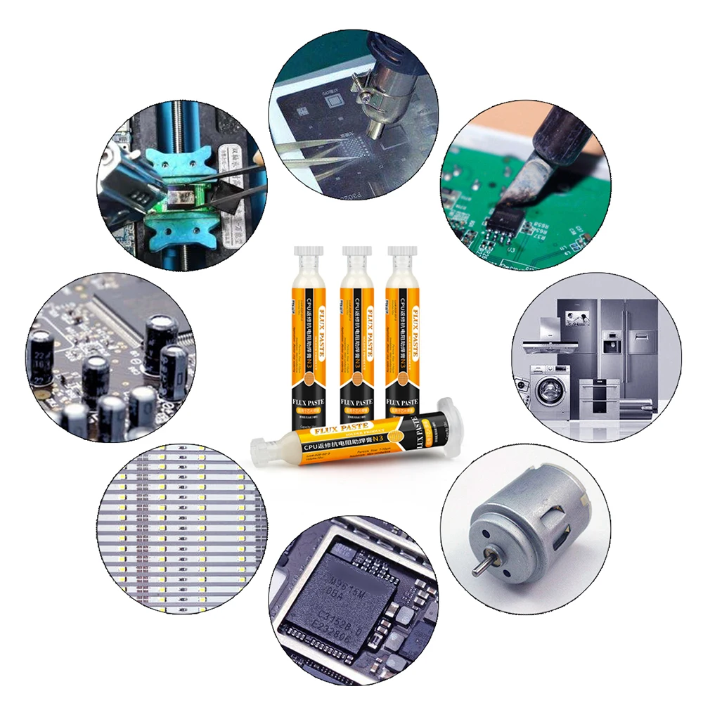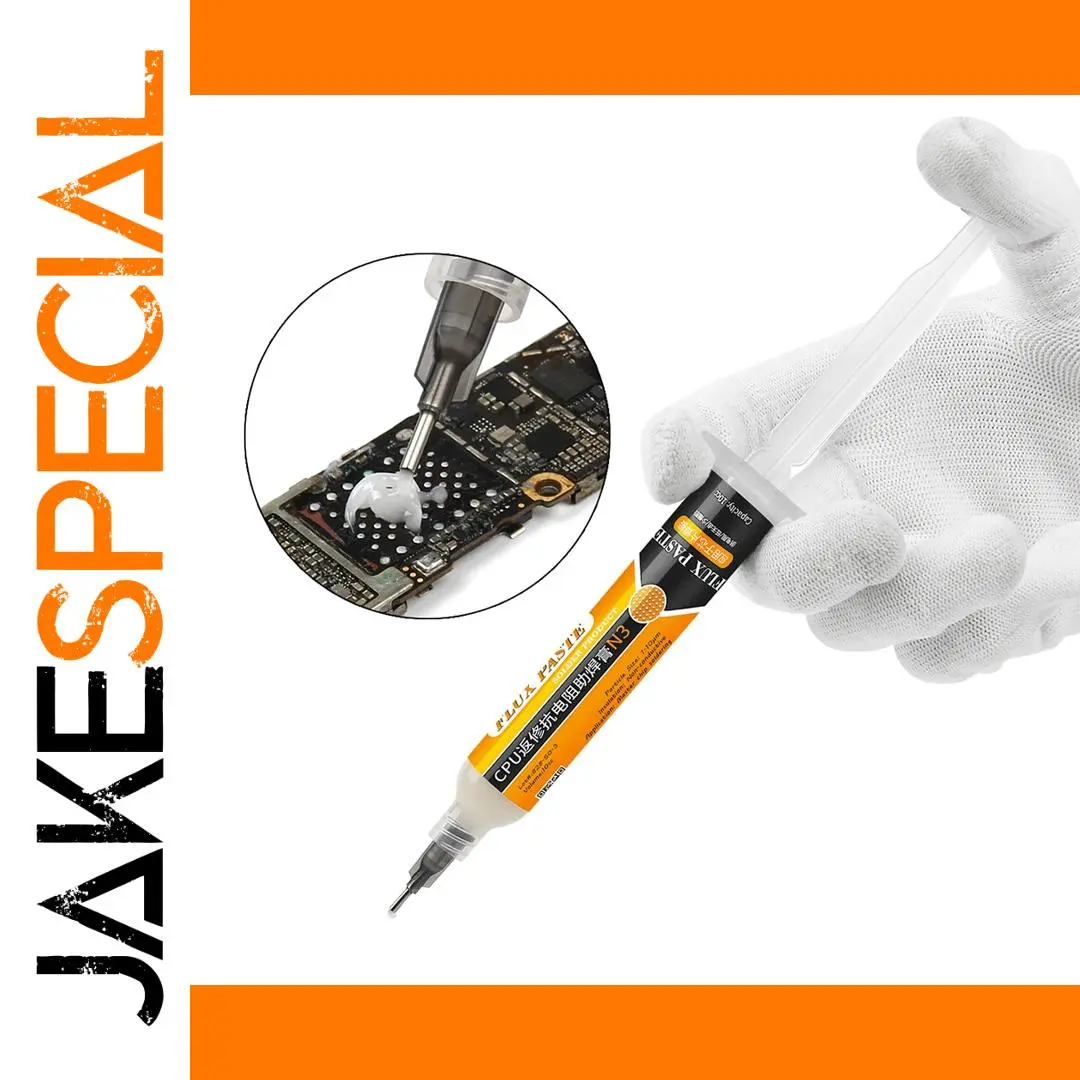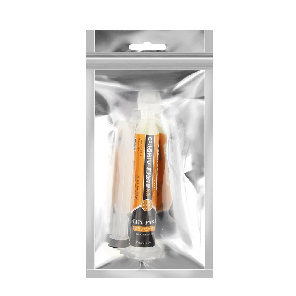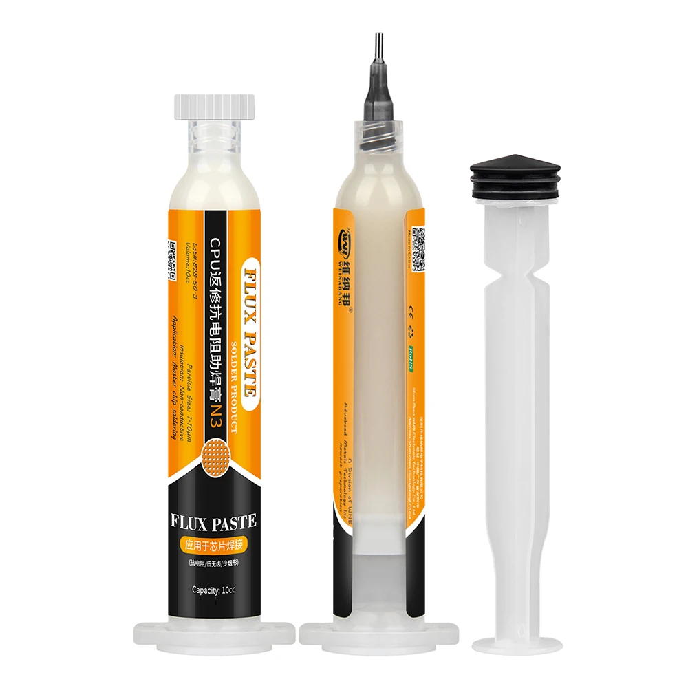 This professional-grade, lead-free and halogen-free soldering flux paste comes in a 10cc syringe with a precision nozzle, ideal for PCB, SMD, and BGA rework on mobile phone and computer motherboards. Featuring low smoke and odor, it ensures clean, precise application for delicate repairs involving SMD, PGA, and BGA components. The transparent syringe highlights the flux’s N3 color, with particles sized between 1-10μm, providing optimal flow and adhesion. RoHS compliant and free of hazardous chemicals, this flux paste includes a push rod, needle, and booster for easy handling, making it an essential tool for advanced electronic repair work.