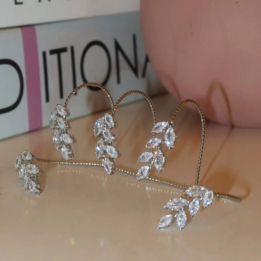 - Technical specifications: cubic zirconia stones, tension setting, leaf motif, available in gold and silver finishes, suitable for multiple occasions like weddings and parties.