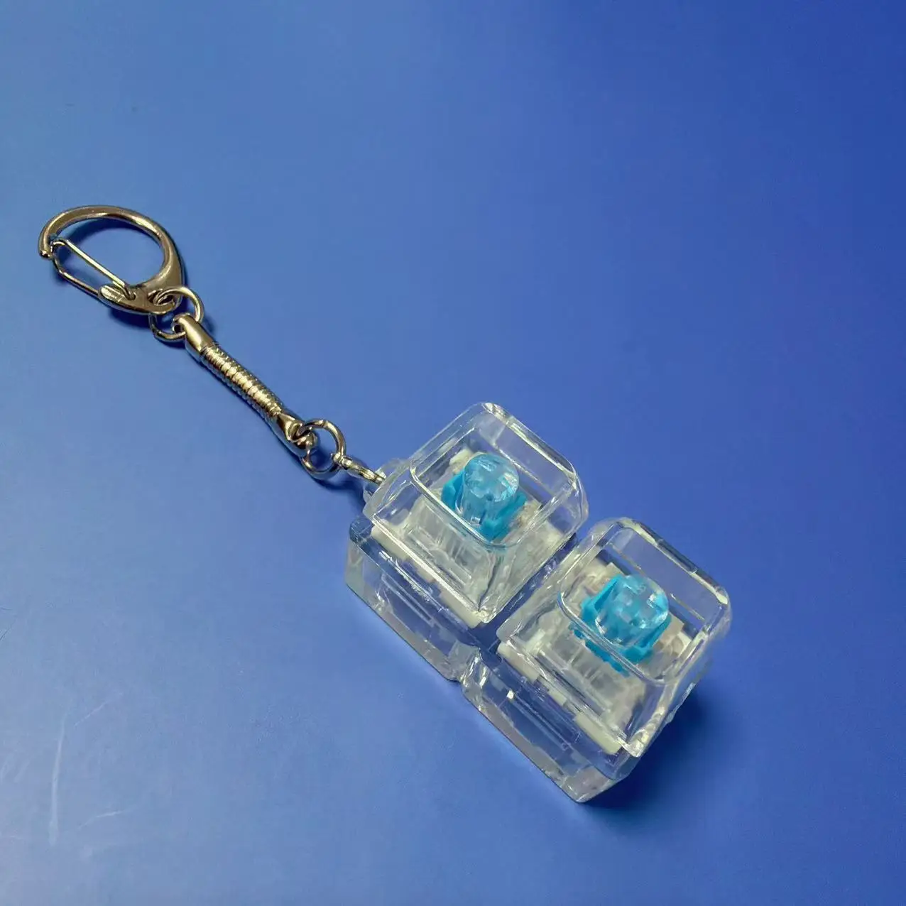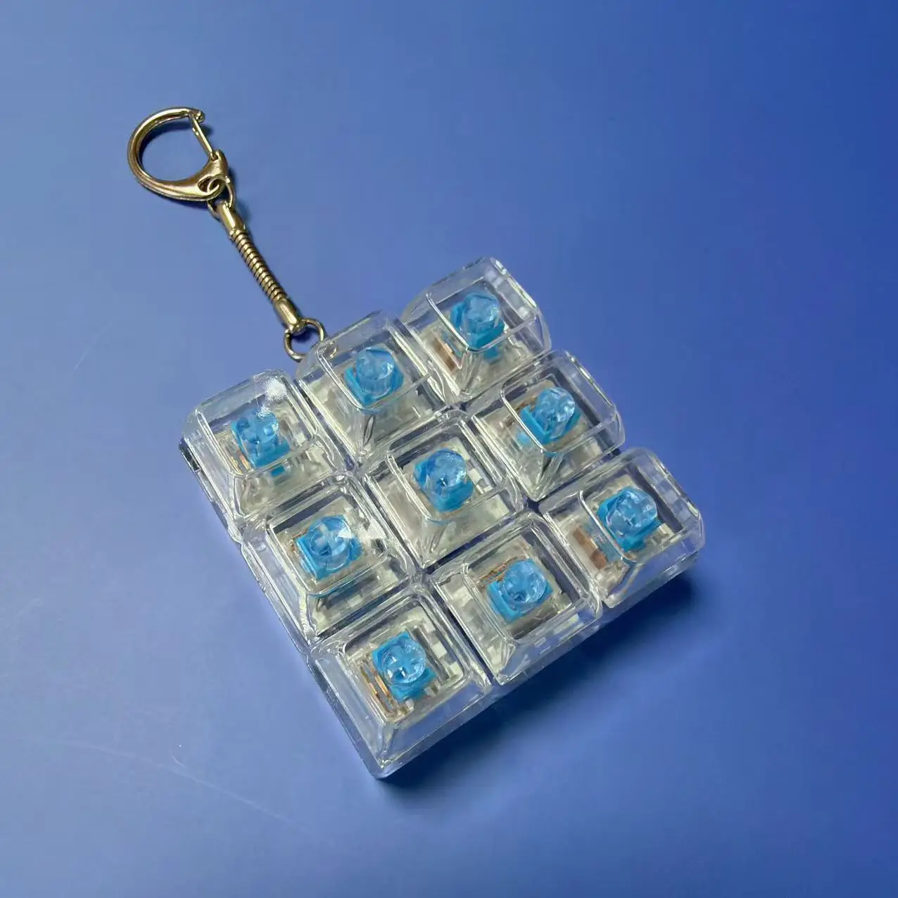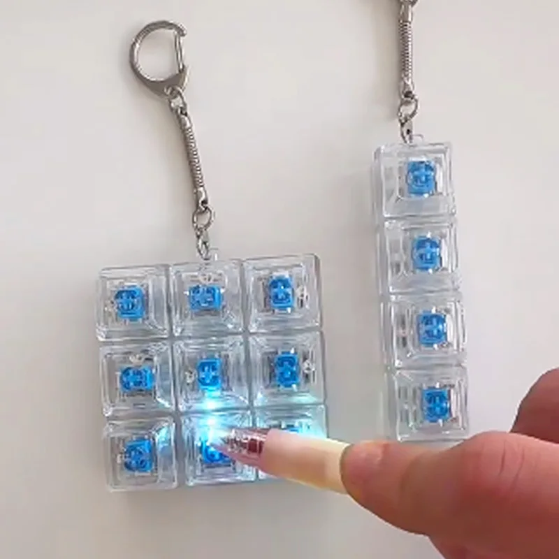 Experience stress relief and fingertip satisfaction with this sleek LED crystal keycap fidget toy, featuring multiple button configurations of 1, 2, 3, 4, or 9 buttons. Encased in a transparent plastic housing that reveals internal light blue accents, the toy offers a luminous, modern aesthetic perfect for portable decompression. Attached to shiny, durable metal keychains available in silver-tone or gold-tone finishes, these tactile, slightly raised buttons are designed for satisfying clicks and easy manipulation. Crafted without high-concern chemicals, this modern stress-reliever is suitable for a wide age range, including children and adults, providing a stylish and functional gadget to help manage tension throughout your day.