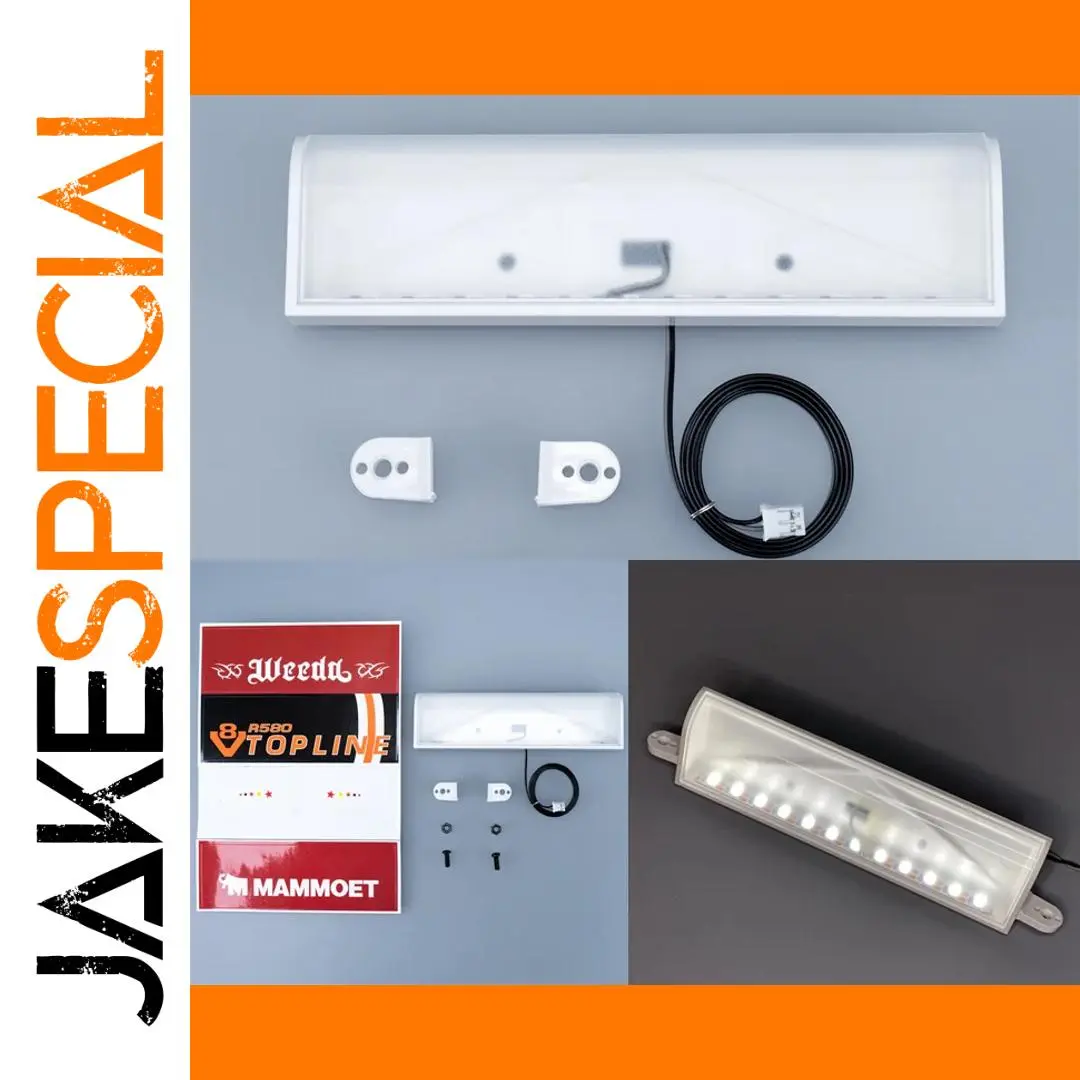 Imagine enhancing your 1/14 scale Tamiya RC truck with a realistic roof sun visor lamp that adds authenticity to your model. Crafted from sleek white ABS plastic, this light box features a smooth, matte finish, rounded edges, and a slightly curved shape for an aerodynamic look. Inside, a bright 5V white LED strip emits a crisp glow, visible through the transparent cover. The LED strip has an adhesive backing for straightforward mounting, while welded wiring ensures durability and easy installation. The optional side light frame provides versatility, allowing you to customize your truck setup. This product is perfect for hobbyists seeking a high-quality, authentic accessory to bring their RC truck to life visually and enhance their building experience.
