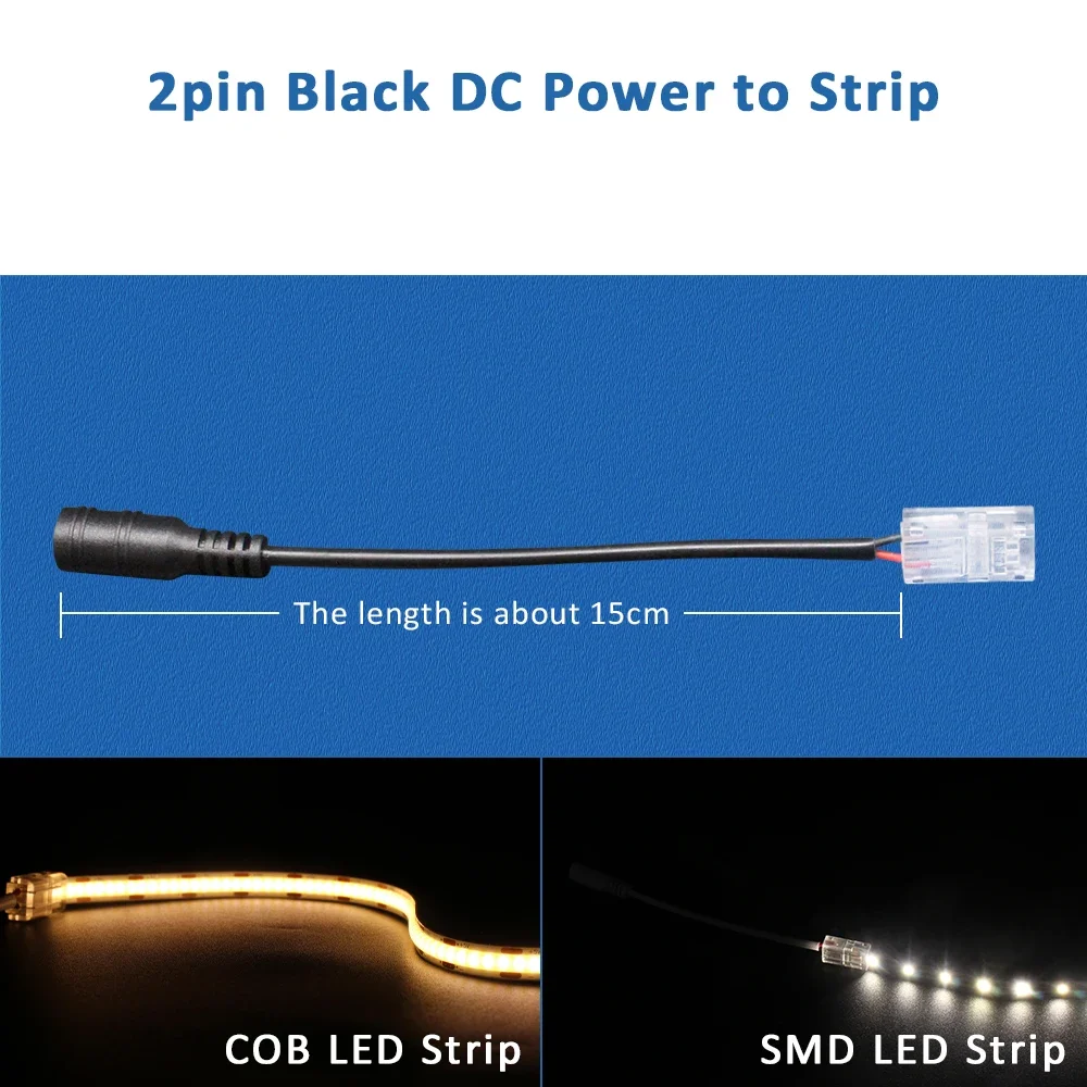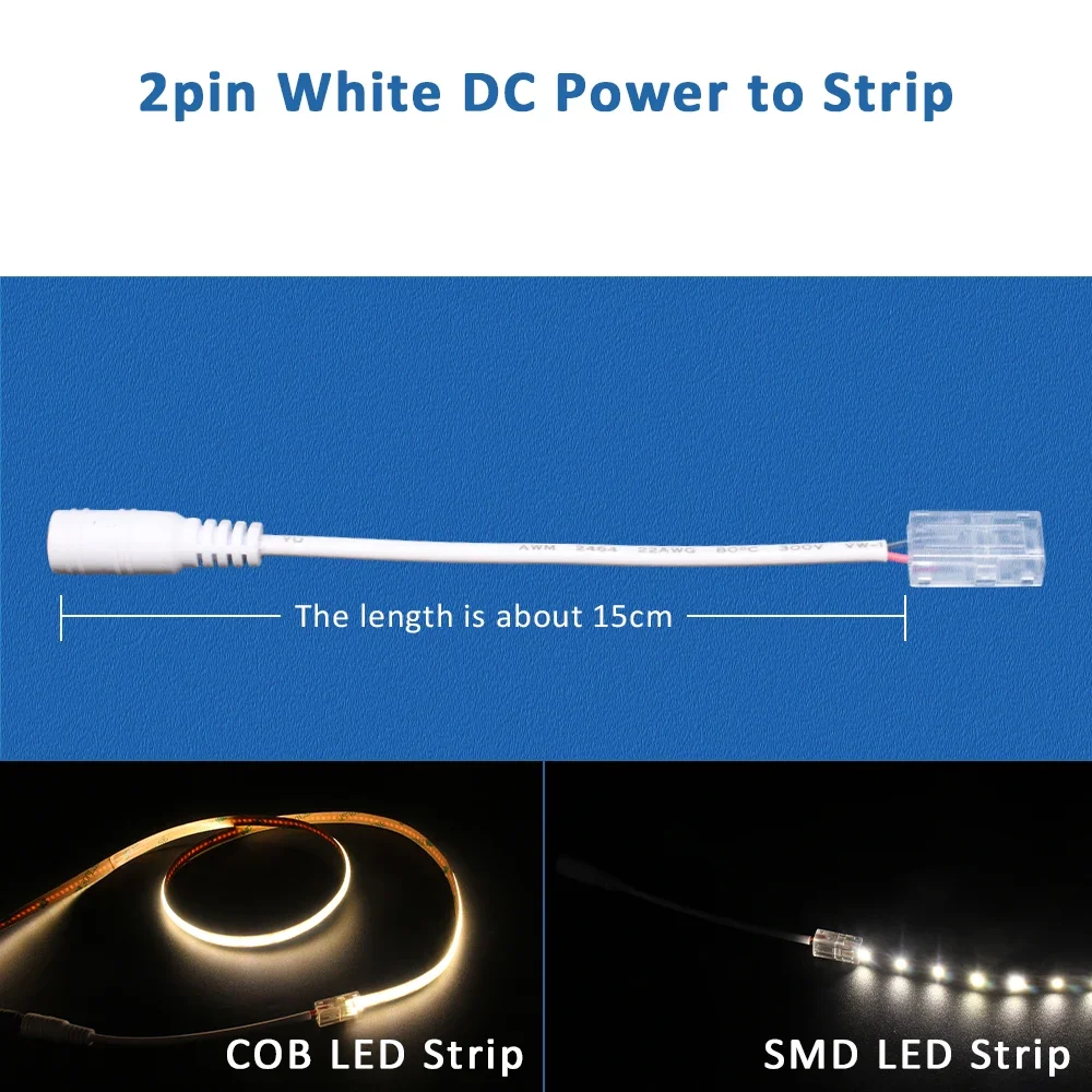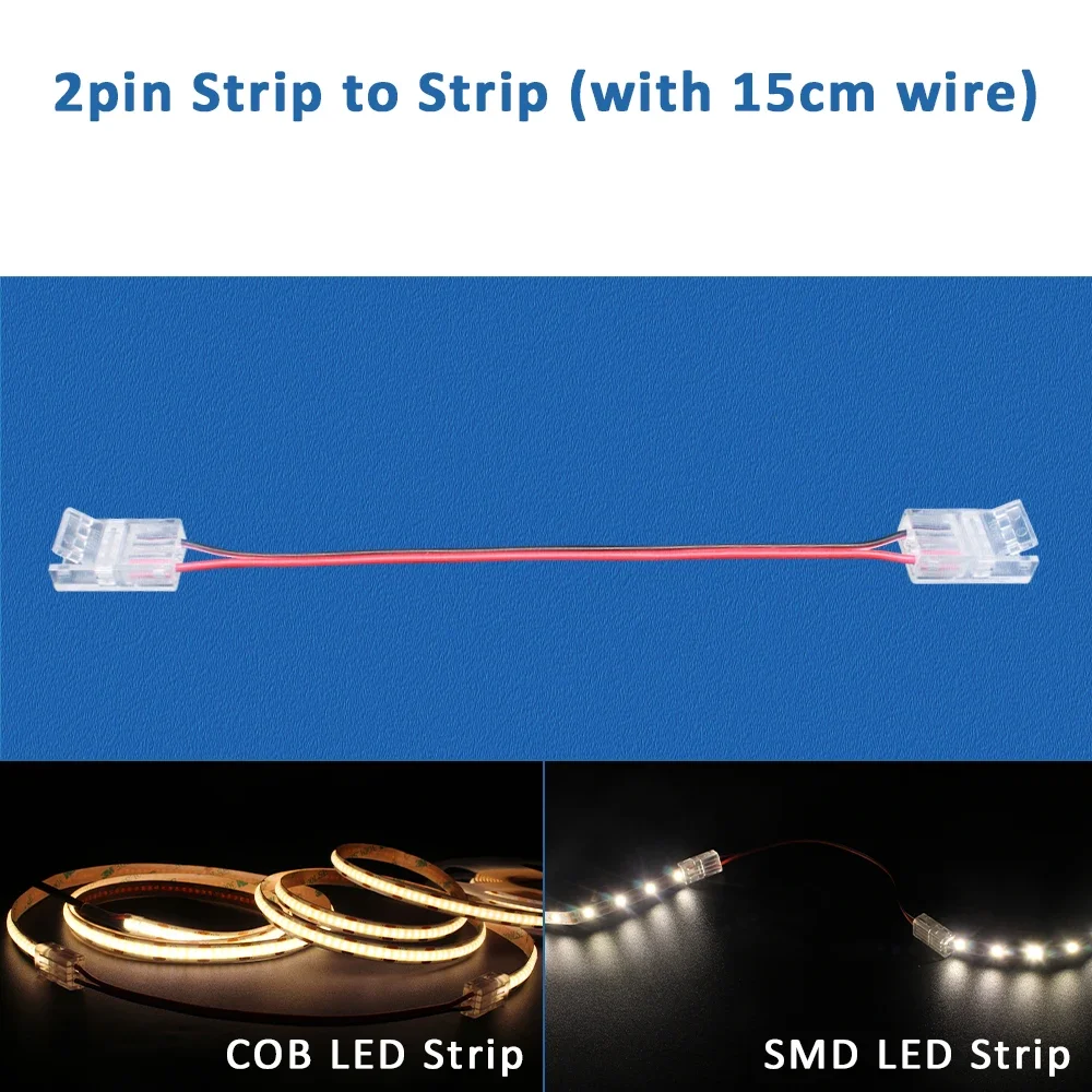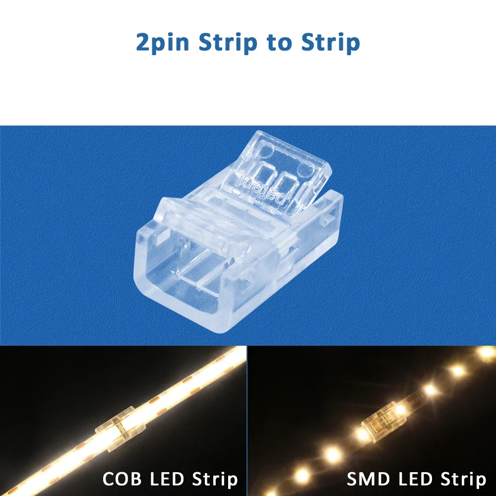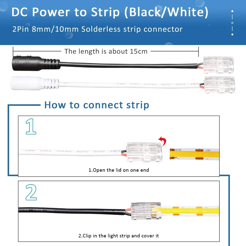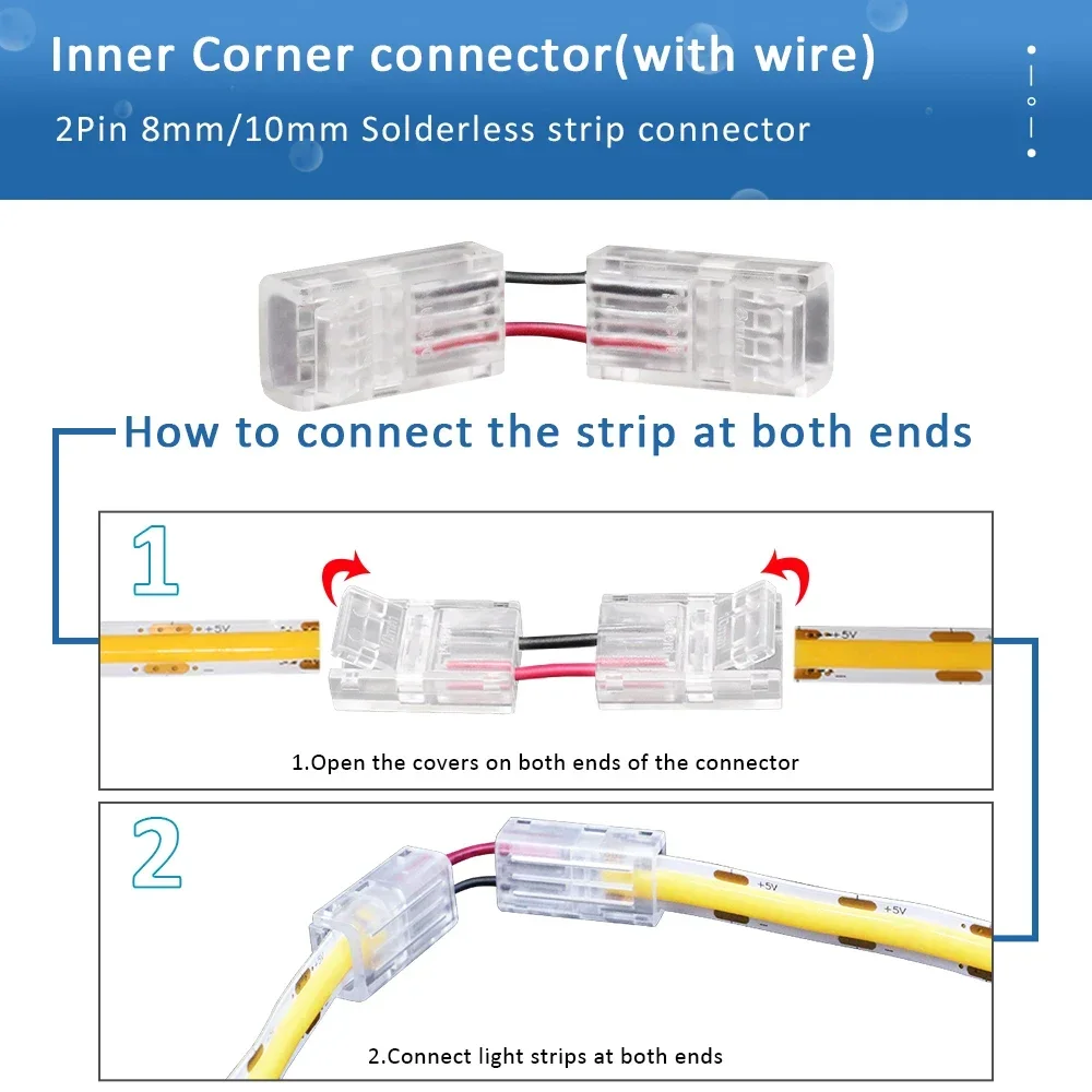 Enhance your LED setup with this set of five welding-free, quick wire 2-pin connectors designed for 8mm and 10mm wide strips, compatible with 2835, 5050, SMD COB, and flexible LED strips operating at 12V. Featuring clean, minimalist designs with transparent housings that reveal internal metal contacts, these connectors include power connectors in white or black, corner connectors for L-shaped setups, strip-to-strip, and strip-to-wire options, all supporting IP20/IP65 ratings. Certified by CE, RoHS, and UL, they provide durable, easy installation for a sleek, modern lighting project or renovation, ensuring a seamless, professional connection every time.