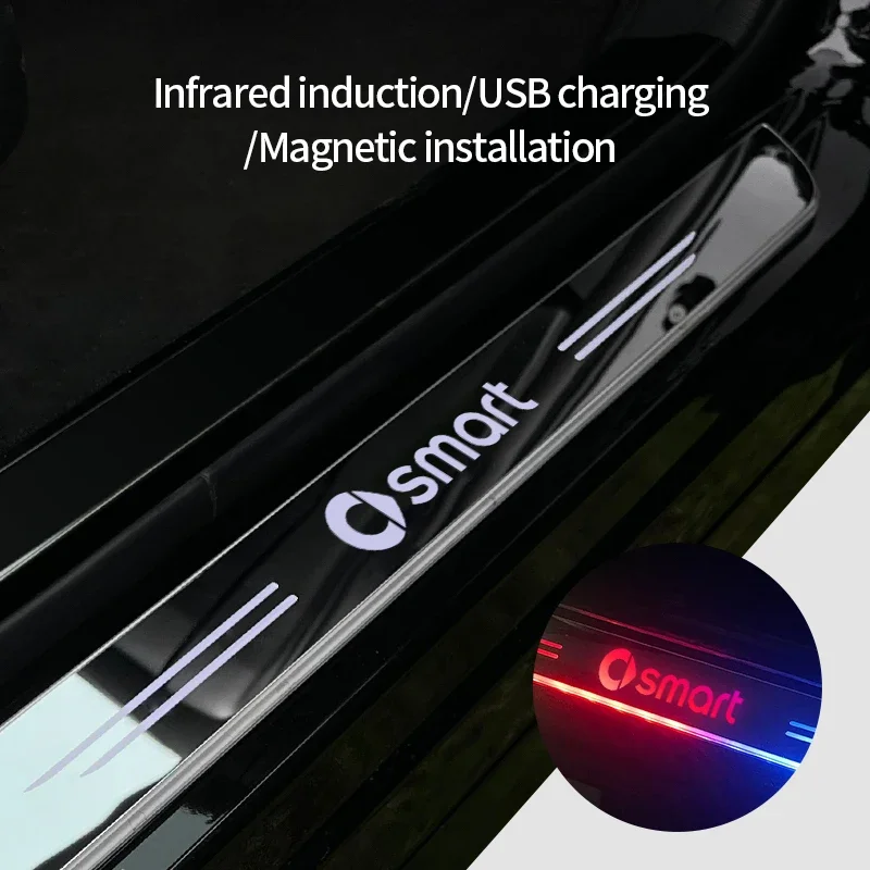 Transform your vehicle's entryway with the Acrylic USB Power Moving LED Welcome Pedal Door Sill Pathway Light. Specifically crafted for various car models including Hyundai, BMW, Mercedes-Benz, and Tesla, this illuminated scuff plate harmoniously combines modern aesthetics with functionality. Featuring a glossy black acrylic finish, the adhesive “smart” logo is backlit by a stunning blue LED glow. This not only enhances the beauty of your car's interior but also creates a welcoming atmosphere when entering or exiting your vehicle. The hassle-free installation, powered by USB charging, allows you to enjoy approximately three months of light without worry. Experience the perfect blend of style and practicality.