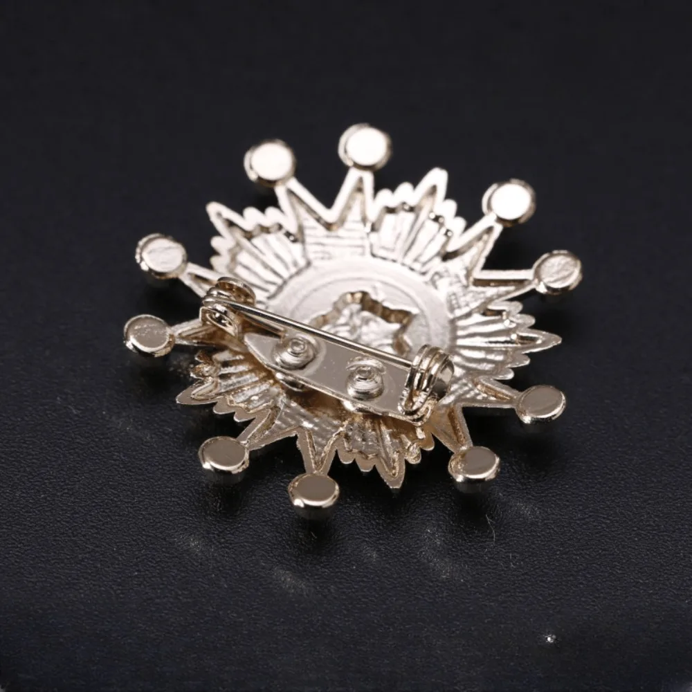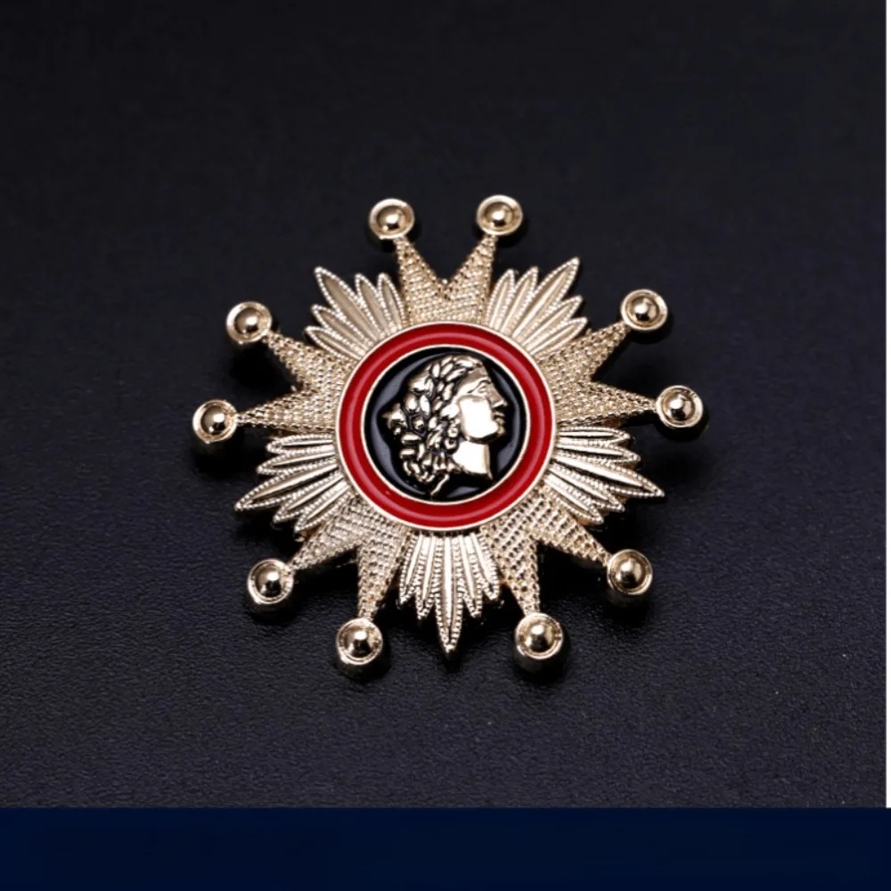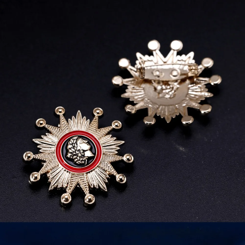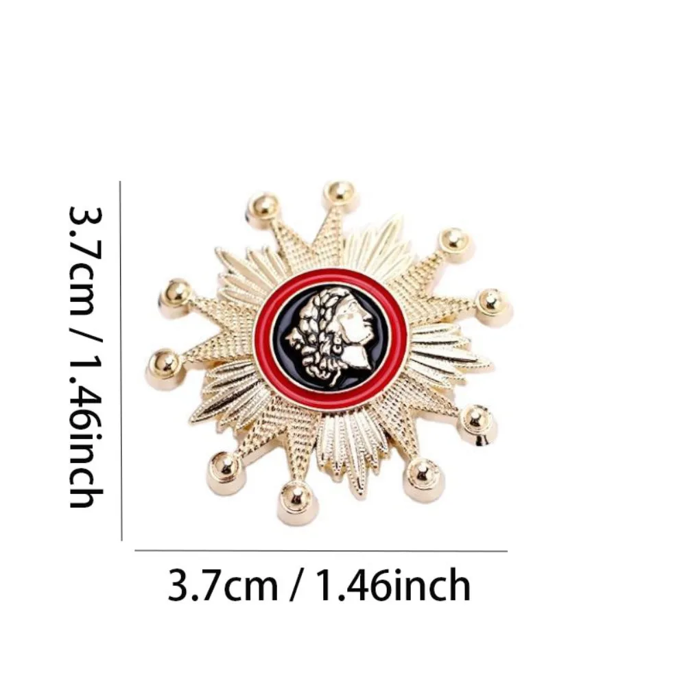The vintage metal brooch pin is styled after the prestigious Legion of Honor badge, featuring an intricate design that exudes elegance. At the center lies a classical profile figure set against a black ring bordered by a bold red outer rim. Surrounding this stunning motif, ornamental rays extend outward in a sun-like fashion, fashioned from a shiny gold-toned alloy that adds sophistication. The textural detailing on these rays and small round domes at their tips enhance this statement piece's opulent look, making it perfect for jackets, backpacks, hats, or DIY projects. Its unisex design and striking color contrast ensure it can elevate any outfit.