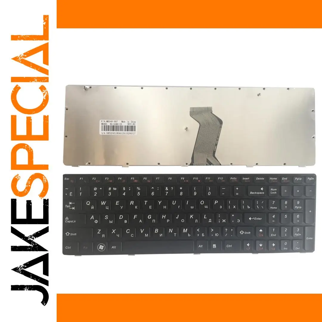 Upgrade your Lenovo laptop with this new replacement keyboard compatible with models G580, Z580, Z580A, G585, Z585, and G590. Designed with a sleek black border and a Russian standard layout, it features clear Latin and Cyrillic characters on textured, plastic keycaps arranged in a standard QWERTY configuration, including a numeric keypad and navigation keys. The sturdy metal backing plate ensures durability, while the flexible ribbon cable allows easy connection. Offering a 180-day warranty, this high-quality keyboard is perfect for restoring keyboard functionality and enhancing your productivity with a reliable, professional-grade component.