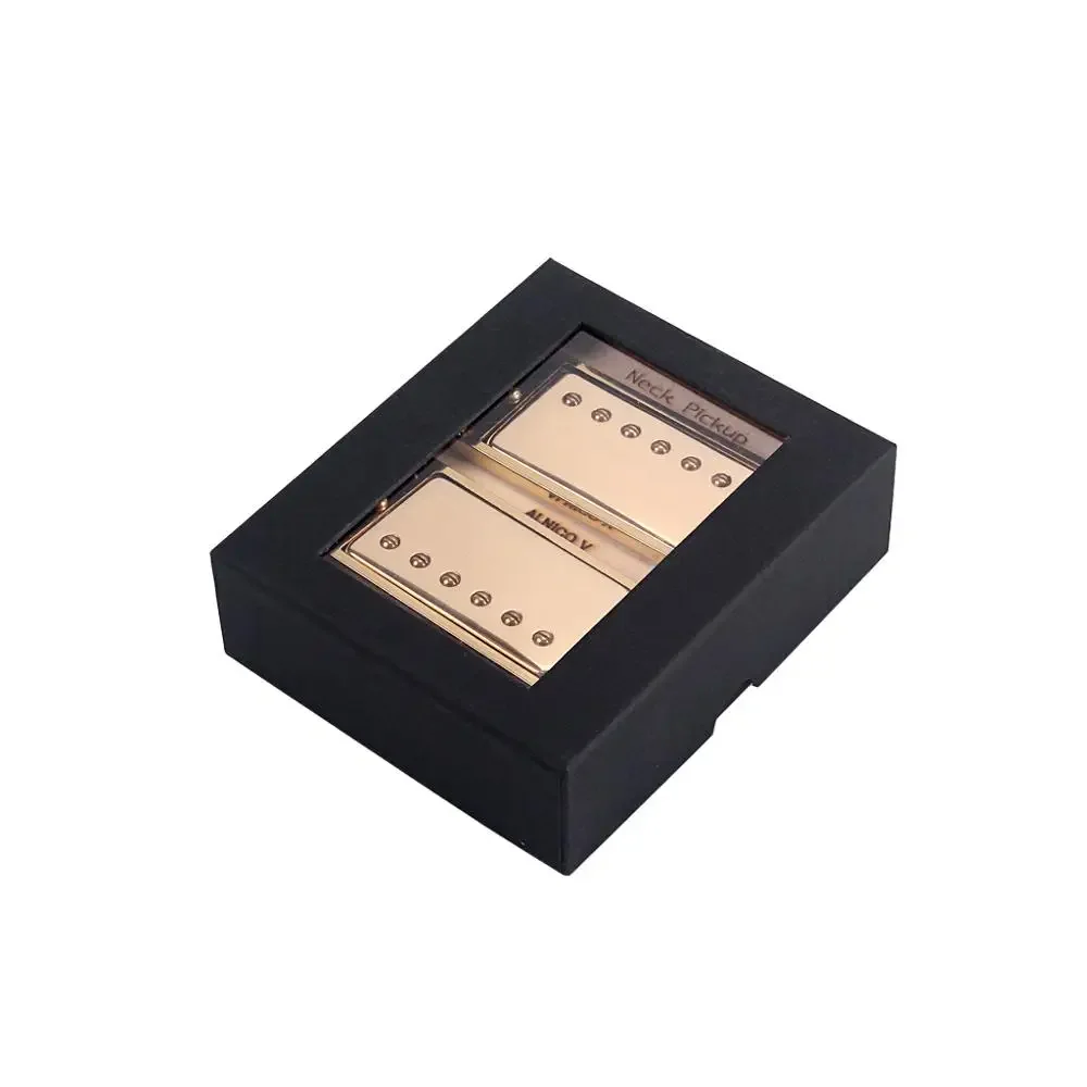 Experience the rich, warm tone of this this 2-Pole Humbucker Pickup Set, perfectly crafted for Les Paul electric guitars. The sleek design features a durable black exterior with a transparent window, showcasing the stunning gold-colored pickups inside. Each pickup boasts a polished, metallic finish with rounded edges, mounted on a matching gold base. The set includes a bridge and neck pickup, both equipped with height-adjusting screws and springs for precise tonal control. The high-quality cupronickel bases and covers ensure lasting durability. With dimensions of approximately 91×45×24mm and a combined weight of 305g, this set seamlessly combines aesthetic appeal and functionality, making your guitar look and sound exceptional.