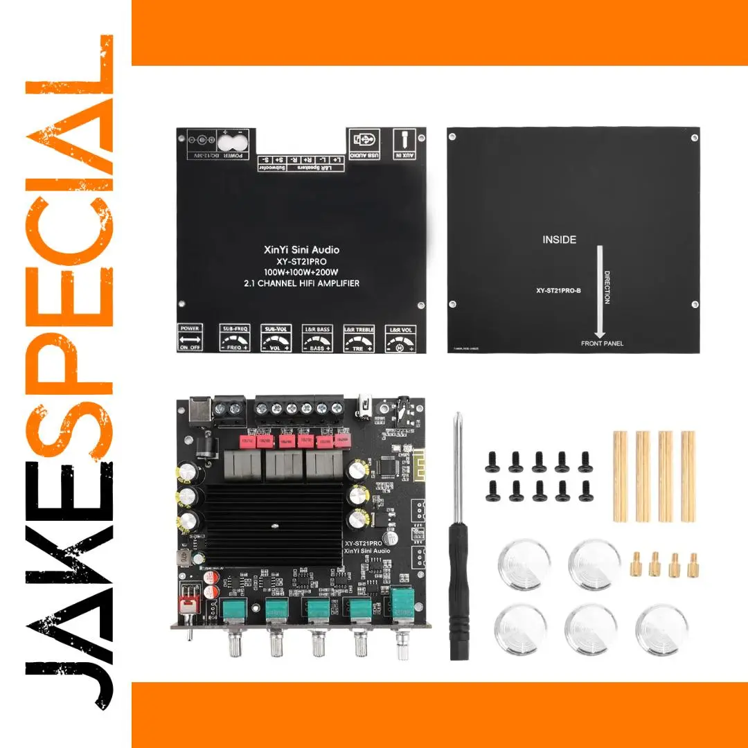 Experience premium sound with this sleek, modern digital amplifier board that combines advanced technical design with an elegant black matte finish. Its compact size of approximately 111mm x 100mm x 23mm without casing, extending to 112mm x 102mm x 28mm with the shell, makes installation seamless in various setups. Equipped with dual TPA3221 chips, it delivers powerful 2.1-channel output, supporting up to 100W + 100W at 8Ω/12VDC and adjustable power options for different voltage and impedance levels. The built-in BT 5.2 interface supports AAC and SBC decoding, allowing wireless streaming from your devices within a range of 10-15 meters. The assembly includes a sturdy black metal shell, carefully designed input/output ports, and accessories for easy installation, ensuring durability and a professional aesthetic.