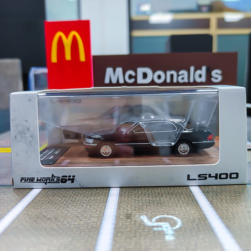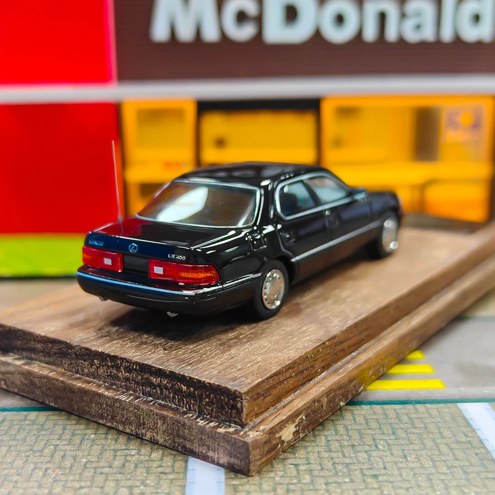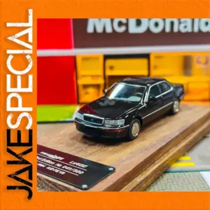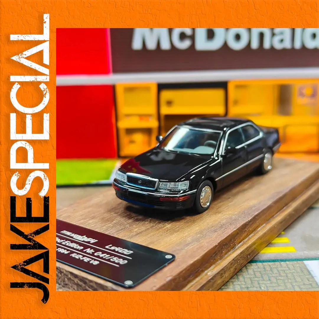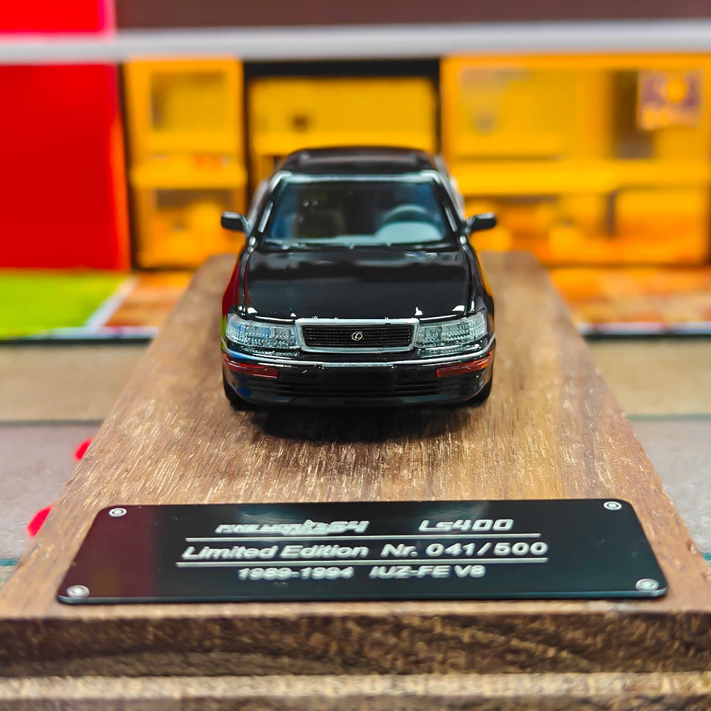 The Lexus LS400 diecast model car is crafted at a 1:64 scale, featuring a sleek black exterior with a glossy finish. This collectible model boasts a detailed front grille, clear headlights, and shiny silver rims on realistic wheels with textured tires. An openable front cover reveals a meticulously designed interior, visible through clear windows showcasing the seats and dashboard. Made entirely from metal, it ensures durability and high-quality aesthetics. The model comes mounted on a polished wooden display base with an engraved metal nameplate, making it an eye-catching display ornament or souvenir gift.