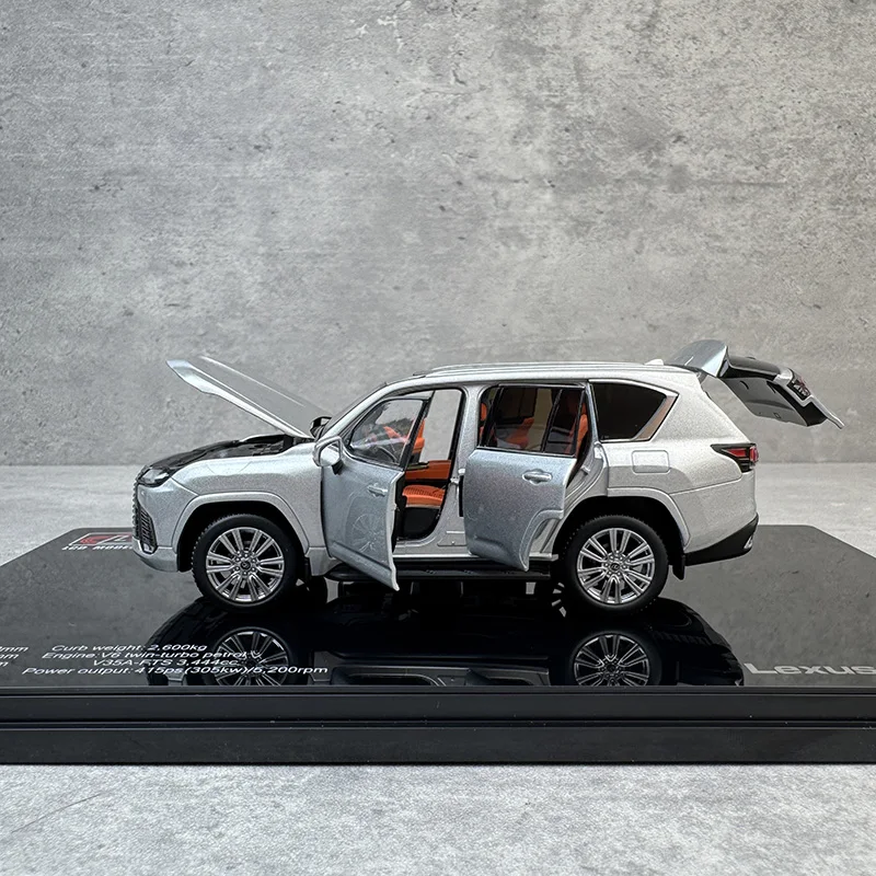 Imagine adding this detailed die-cast Lexus LX600 model to your collection, perfectly capturing the sleek, modern design of the real vehicle. Finished in a sophisticated metallic silver or grey, this 1:64 scale replica offers an ultra-realistic appearance with shiny chrome-plated grille, finely detailed headlights, and multi-spoke alloy-like rims. The open hood reveals a meticulously crafted engine with black and silver components, while the transparent windows showcase the brown or tan interior, dashboard, and steering wheel. The side mirrors, rear spoiler, and roof features like a sunroof enhance its sporty elegance. This collectible displays craftsmanship that guarantees you a premium look, adding a touch of luxury to your collection or display shelf.
