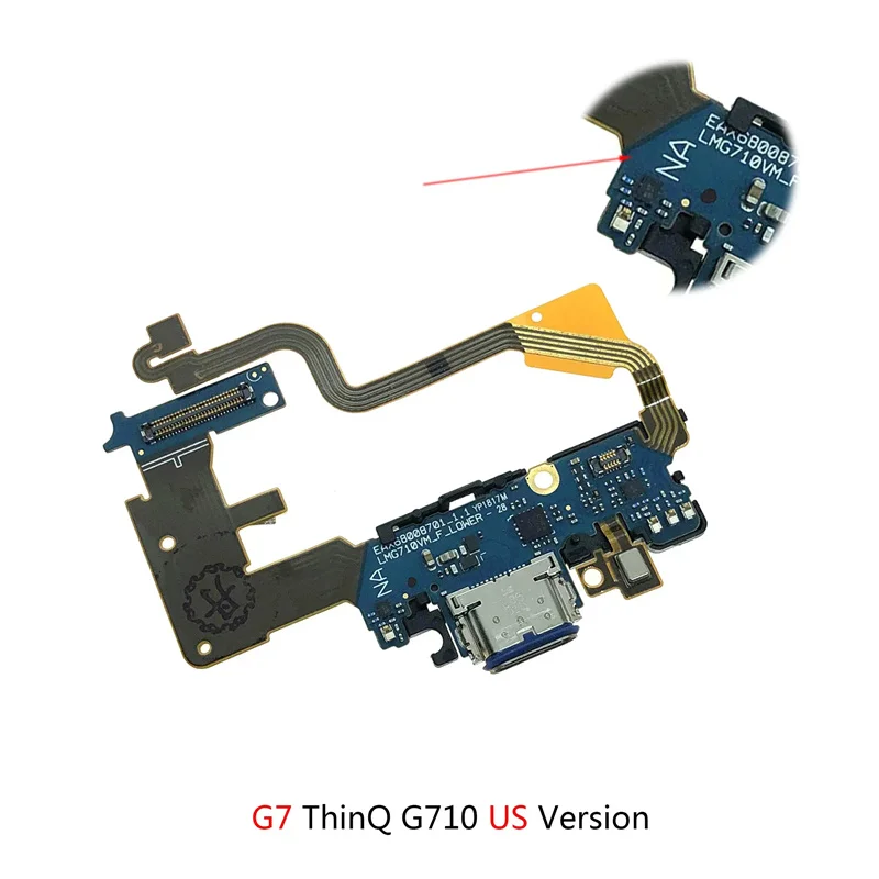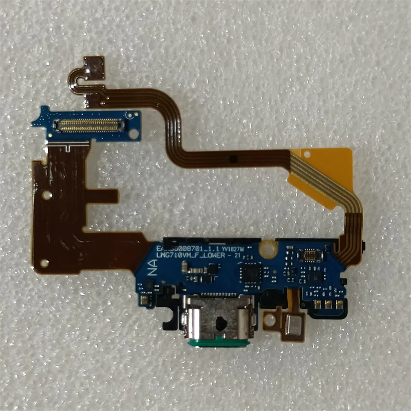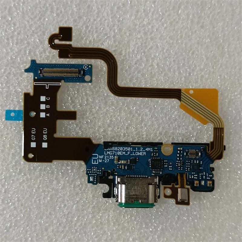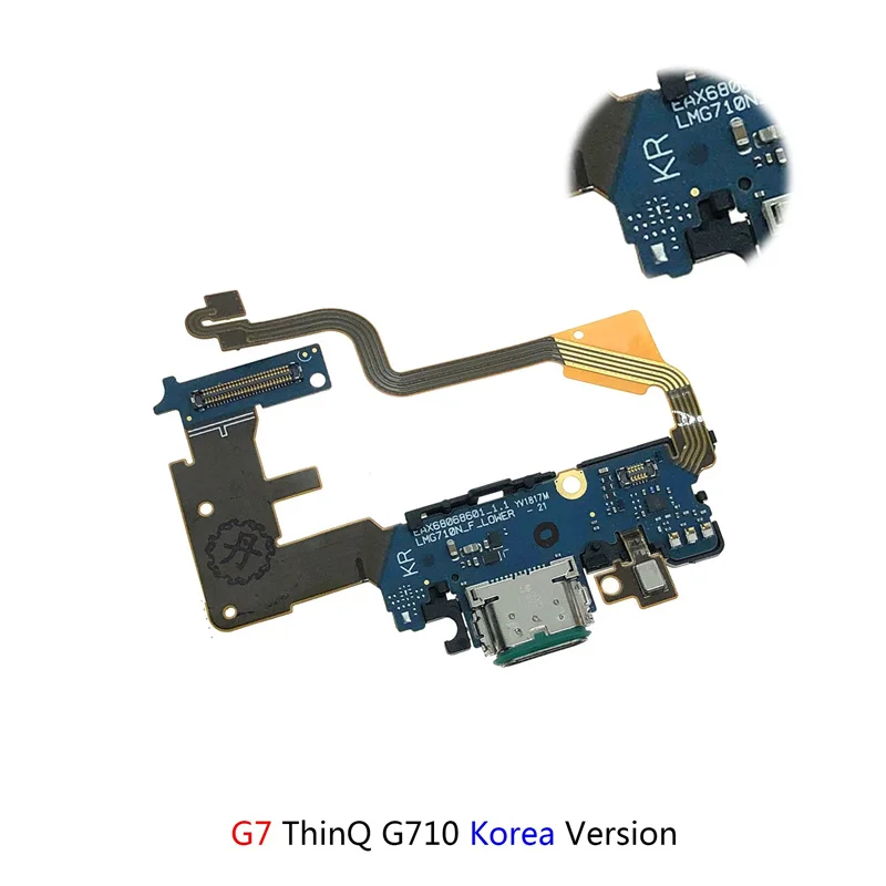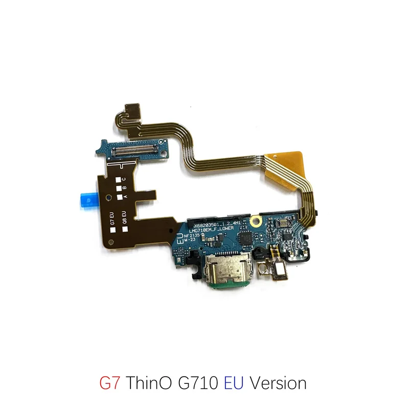 This replacement USB charging dock port connector board designed for LG G7 ThinQ models (G710, G710EM, G710VM, G710N) features a sleek, elongated blue PCB with a black connector area and a flexible flat ribbon cable in a warm brown-orange hue with gold conductive traces. The compact, durable component includes precise mounting points and small metallic connectors for seamless integration, restoring charging and data transfer functionality. Compatible with regional versions including KR, EU, and US, it offers a perfect fit, easy installation, and reliable performance for your device’s repair needs.