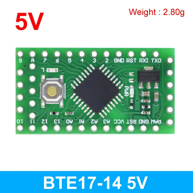 - White silkscreen labels along the edges indicating essential pin functions such as GND, RST, RXI, and TXO for clear identification.