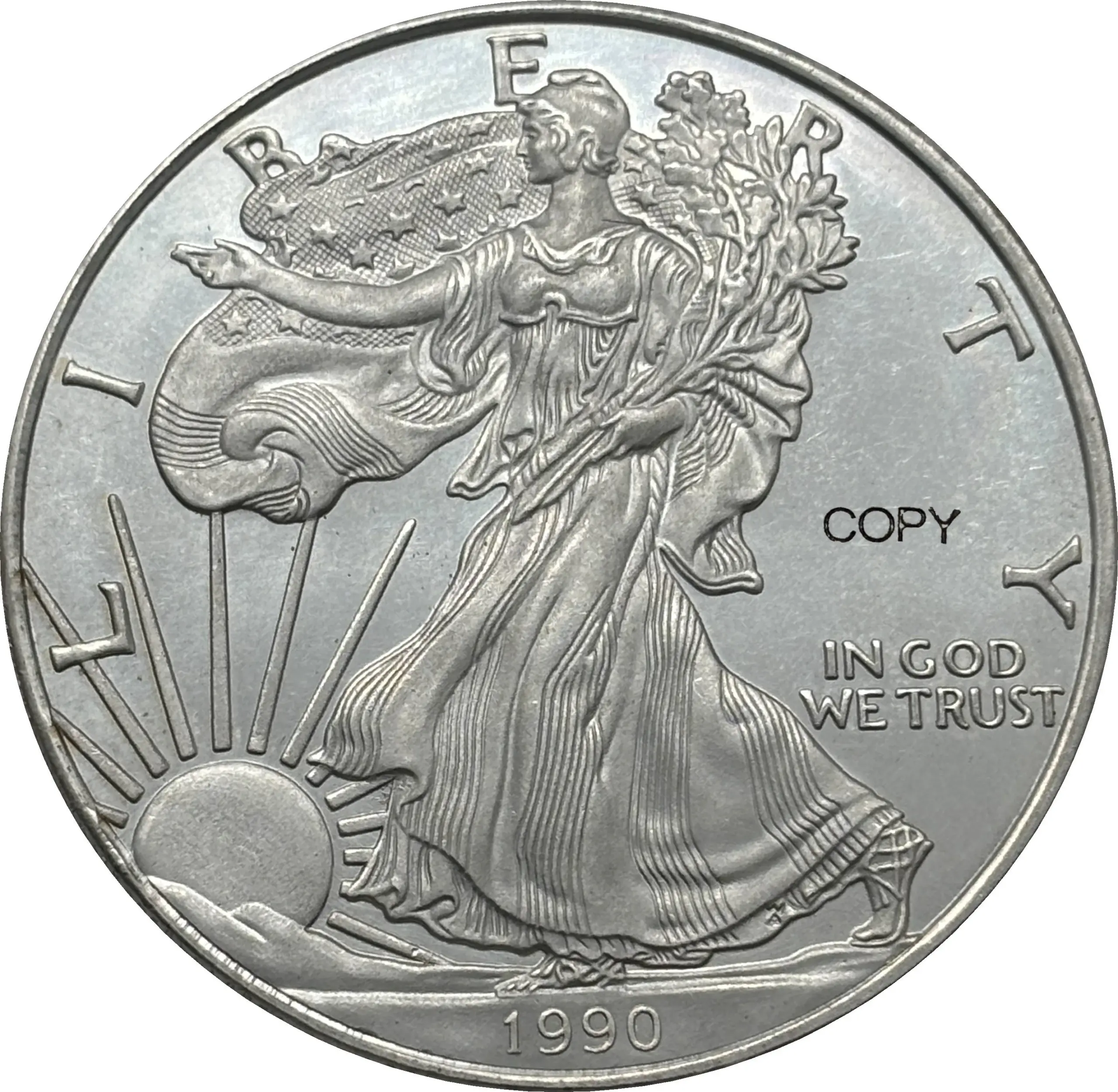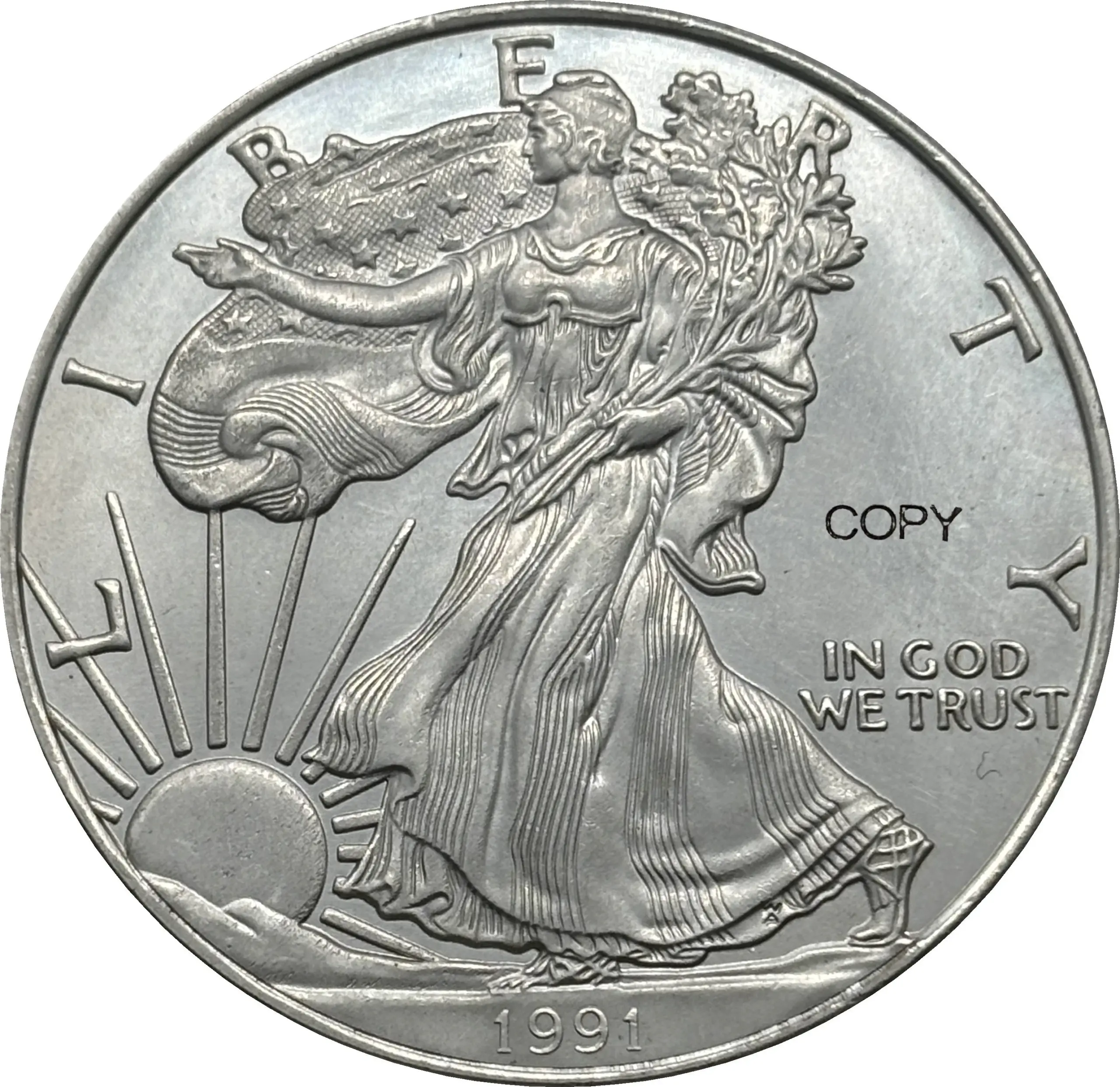 - Obverse features Lady Liberty with flowing gown, holding a torch in her right hand and an olive branch in her left, exquisitely detailed with textured hair and drapery folds.