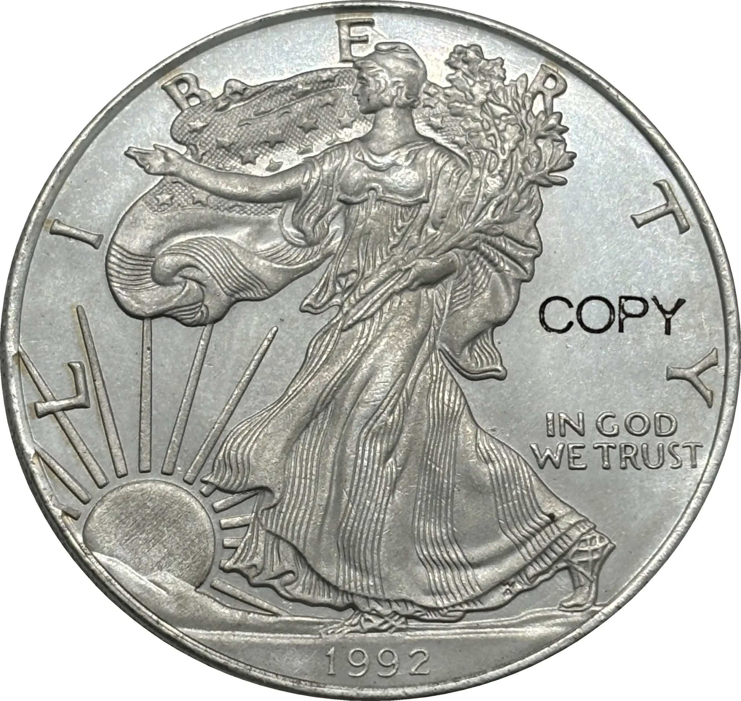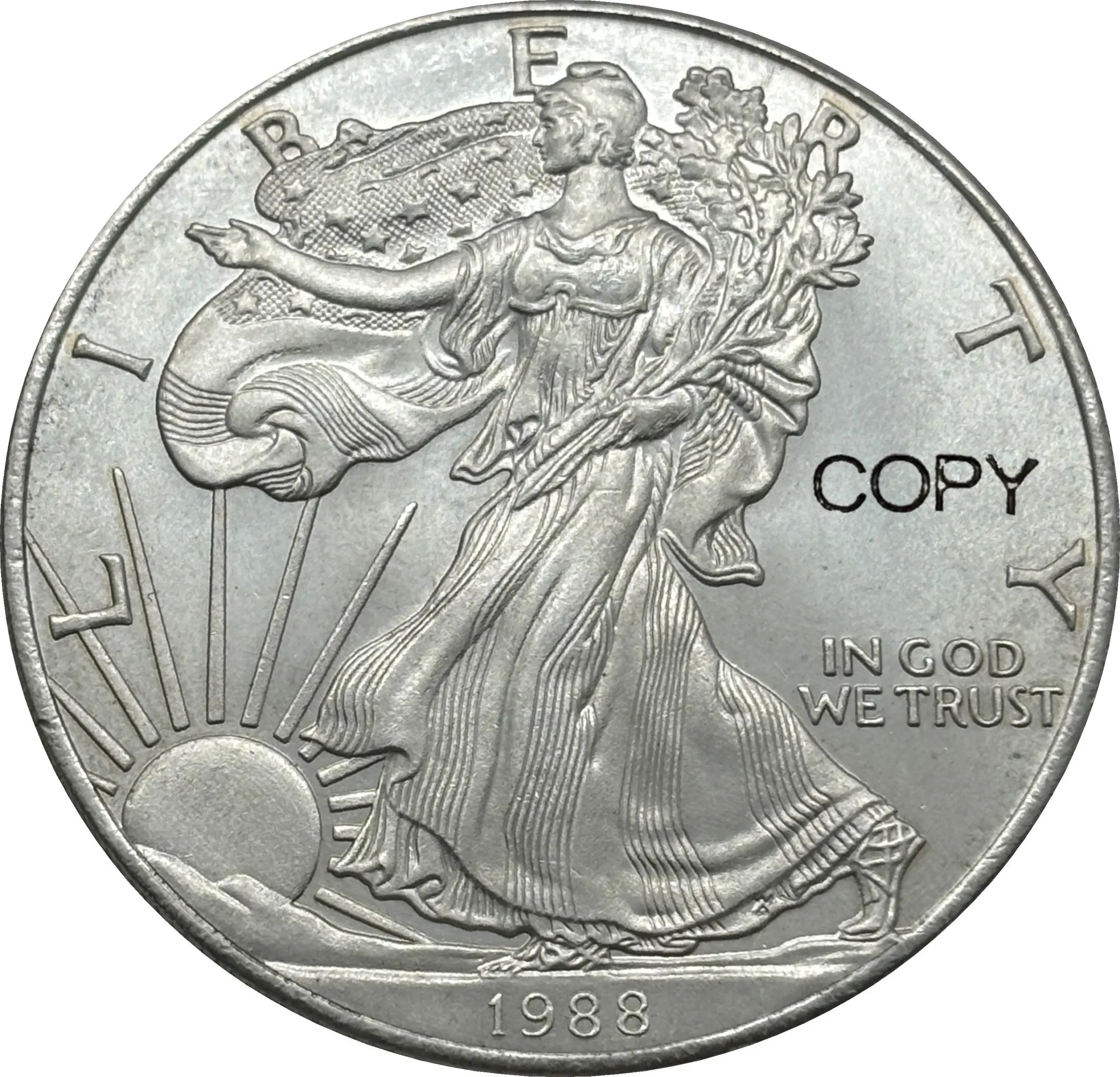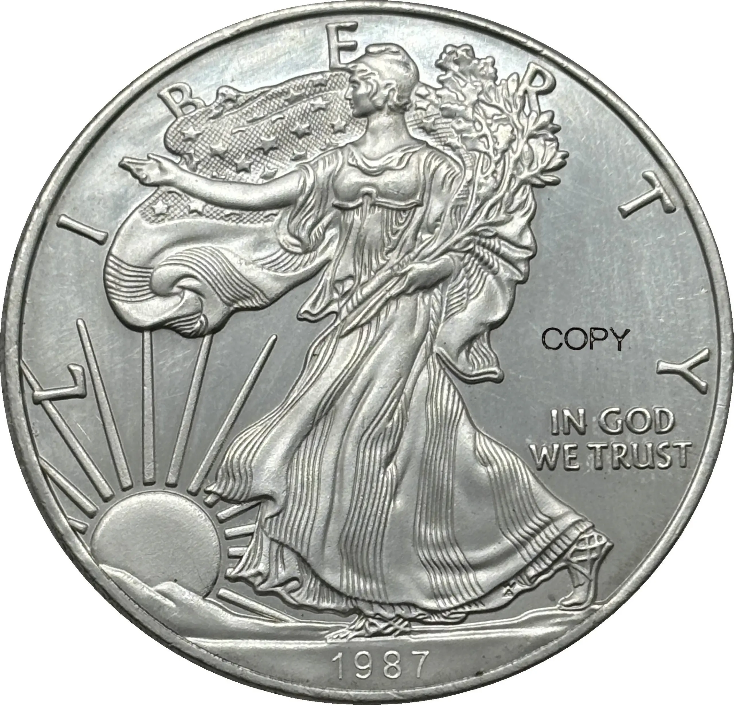 Experience the timeless charm of this beautifully crafted 22-piece Liberty replica set, designed to captivate collectors and enthusiasts alike. Each replica features the iconic obverse of Lady Liberty, elegantly holding a torch and olive branch, with intricate detailing on her flowing gown and hair that reflect exceptional craftsmanship. The reverse displays a majestic eagle with outstretched wings clutching an olive branch and shield, surrounded by detailed stars and inscriptions, all rendered with precision. The shiny silver finish gives these pieces a polished, sophisticated look suitable for display or enhancement to any collection. The central piece is larger, emphasizing its importance, creating a striking visual impact. Discover a perfect blend of artistry and patriotism with this set.