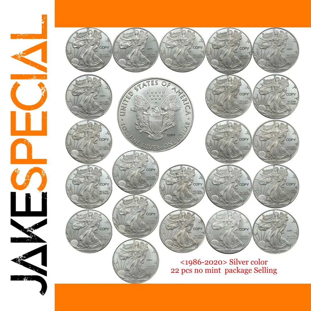 - The central piece is larger, highlighting its significance; it bears inscriptions “1986-2020” and “Silver color 22 pcs no mint package Selling” in red, emphasizing its commemorative nature.