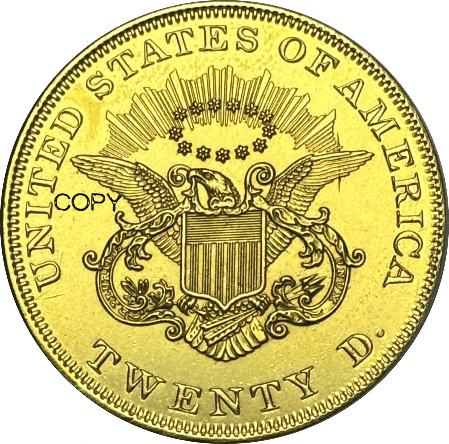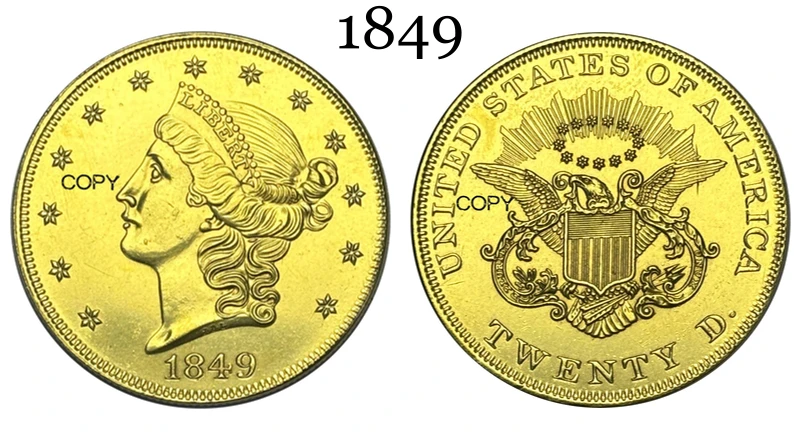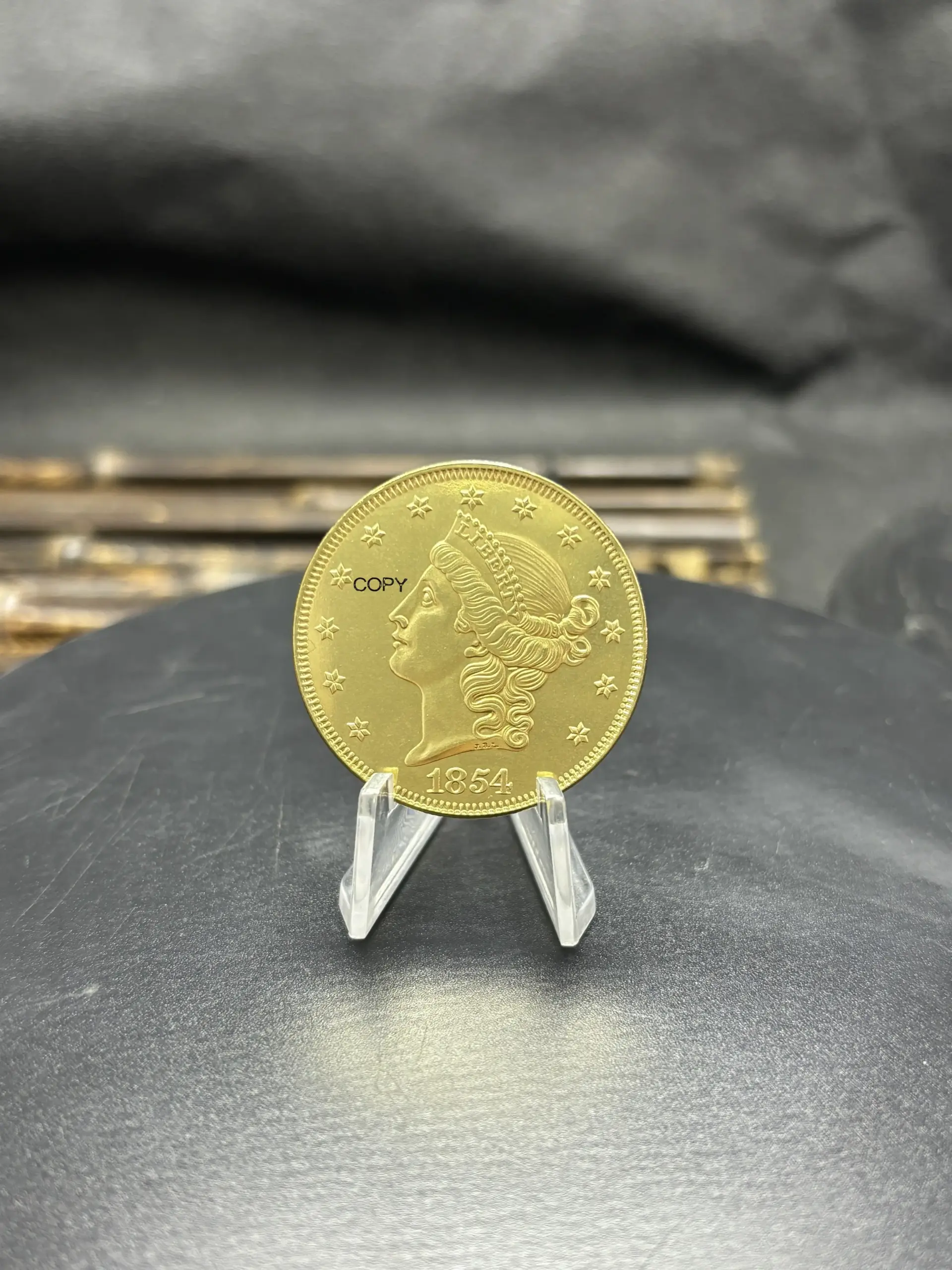 Imagine adding a touch of vintage elegance to your collection with this exquisite replica. Crafted from durable metal, it boasts a polished, reflective gold surface combined with an antique finish that gives an authentic aged appearance. The intricate design features Lady Liberty in profile facing left, her flowing curls textured with fine precision, and a headband inscribed with “LIBERTY.” Surrounding her are small engraved stars and a delicately detailed beaded border, capturing the timeless style of the original coins minted between 1849 and 1862. The realistic vintage look, coupled with subtle variations in design based on different years and mint marks, ensures this piece is both a beautiful display item and a meaningful collector’s treasure. Enhance your space or collection with this remarkable piece that echoes history and craftsmanship.