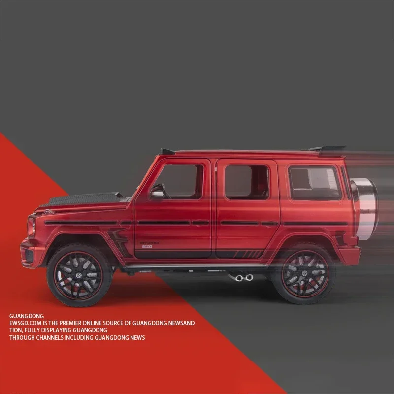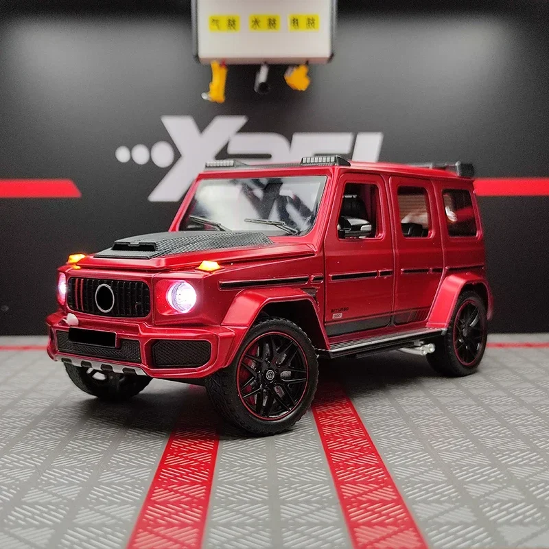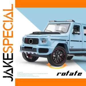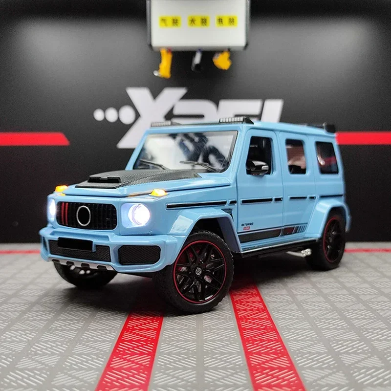 Experience the thrill of adventure with this detailed 1:24 scale diecast alloy car model, designed for enthusiasts and collectors who appreciate off-road aesthetics. The vehicle features a bold, boxy shape with a vibrant light blue finish that highlights its rugged appeal. Its broad windshield, large rounded headlights, and black grille with vertical slats and red accents give it a sporty, dynamic look. The side mirrors and door handles add realism, while black trim lines provide a sleek touch. Equipped with roof-mounted black light bars and a central hood vent, this model exudes utility and adventure. Large textured tires, pronounced wheel arches, and black rims with red trim complete its tough, off-road style. Perfect for display or imaginative play, it brings excitement to any collection.