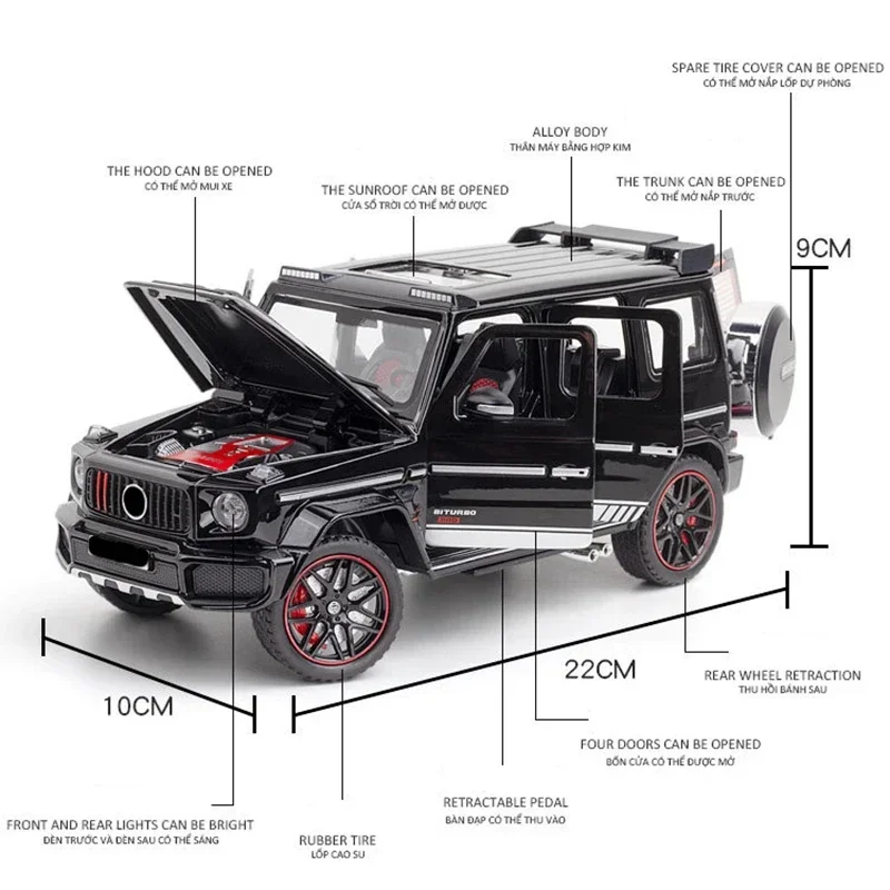 - Includes detailed door handles, black trim lines along the body, roof-mounted light bars, and a central hood vent for added authenticity.