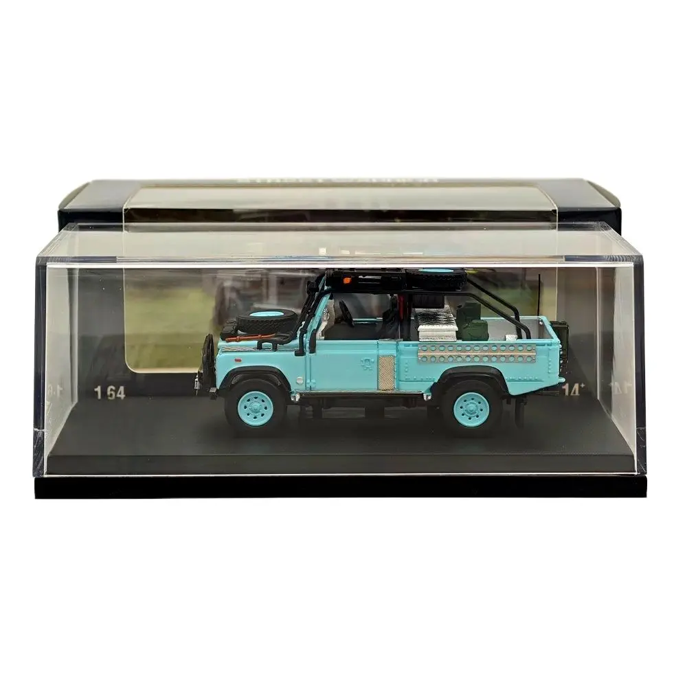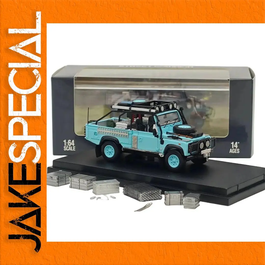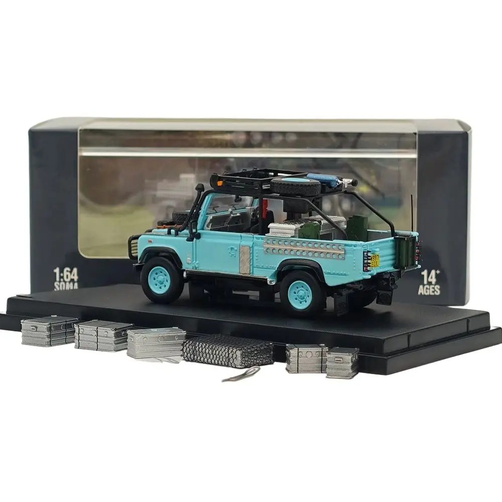 Experience the craftsmanship of this detailed diecast model of the Defender 90 Pickup, scaled precisely at 1:64. Designed for collectors and enthusiasts alike, this miniature vehicle captures the rugged style and realistic features of the full-sized version. Its vibrant light blue finish pairs with sleek black and silver accents, giving it a fresh and striking appearance. The model features functional doors and a hood that can be opened for added realism. Detailed elements like a spare tire mounted on the hood, a roof rack with lights and ladders, and side storage compartments make it a true miniature masterpiece. Its polished surfaces and authentic details allow you to appreciate the craftsmanship up close. This model is the perfect display piece for your collection, adding a touch of adventure and realism to any display setting.