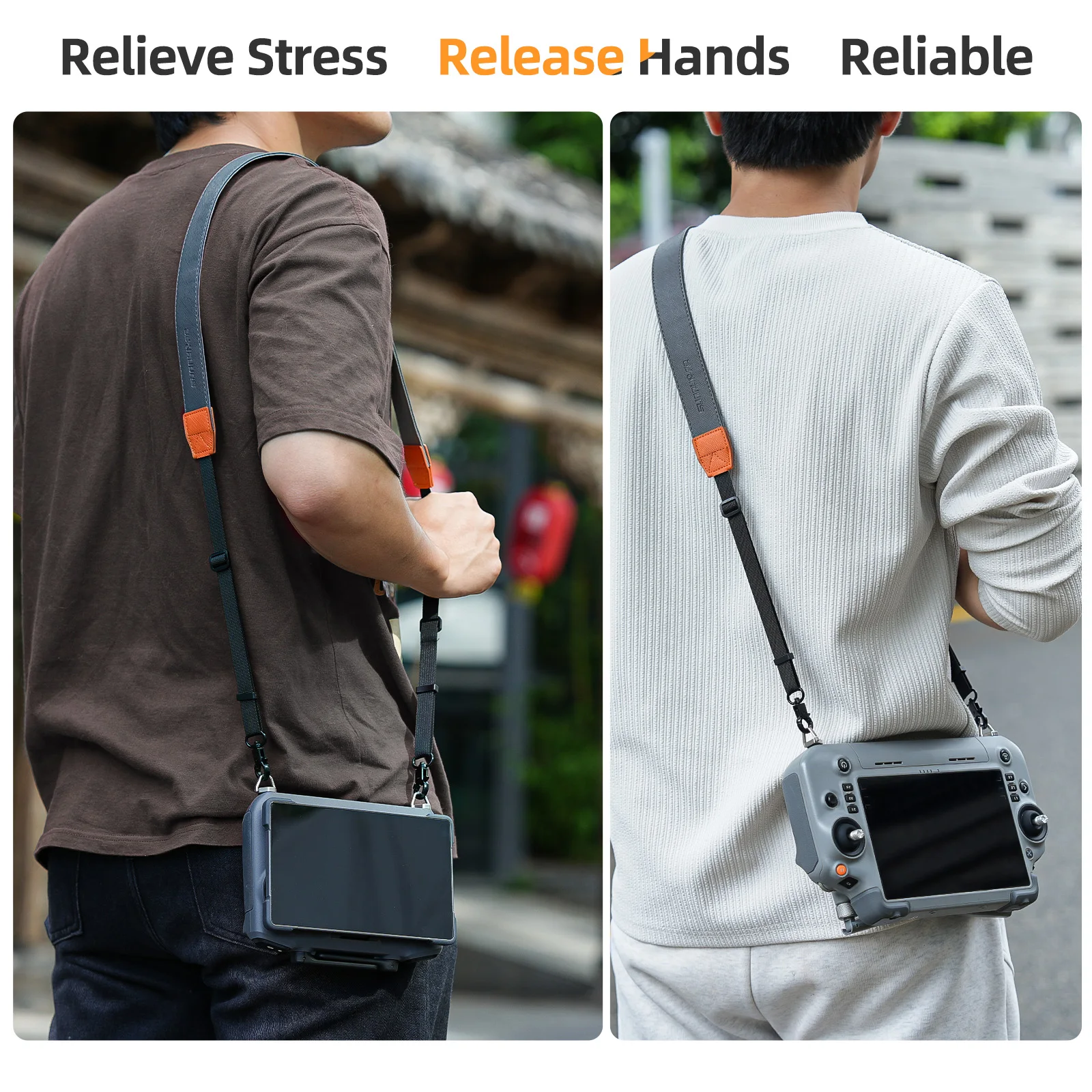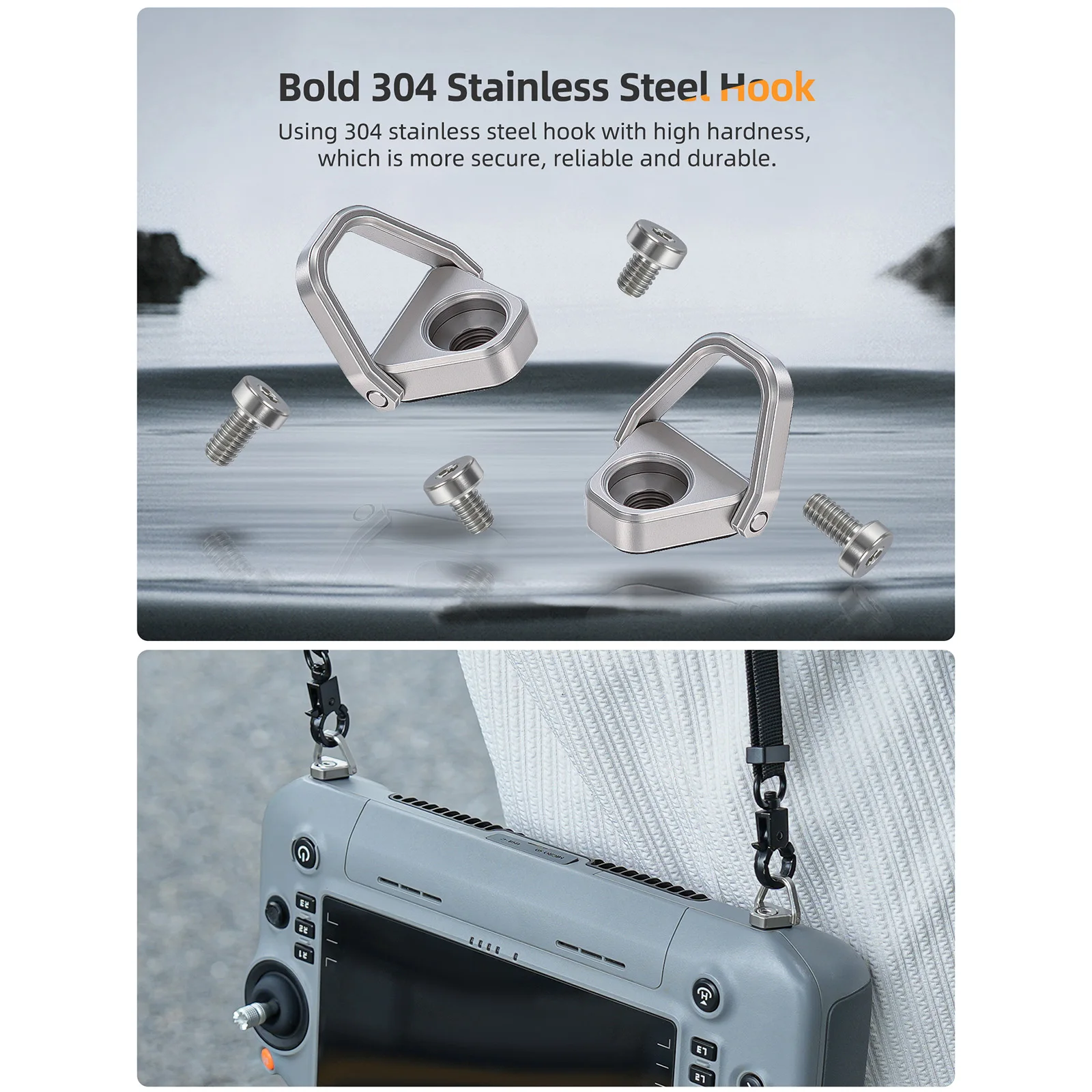 Experience unmatched convenience and style with this light grey DJI controller lanyard. Crafted from durable PU leather and high-density woven tape, this strap offers a sleek, professional appearance that complements your drone gear perfectly. Its adjustable length from 62.5 to 80 cm ensures a comfortable fit, whether you're outdoors or indoors. With a foldable buckle, you can easily store and carry it without hassle. The strap's reinforced orange stitched patches add a vibrant touch while enhancing durability at connection points. The stainless steel hooks are foldable, making storage simple, and their polished metallic sheen adds a modern industrial vibe. This lanyard is designed to provide peace of mind, ensuring your controller is always secure, stylish, and ready for your next flight adventure.