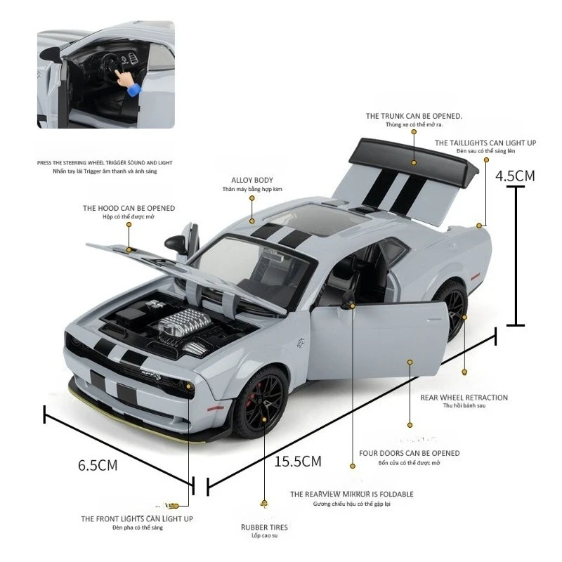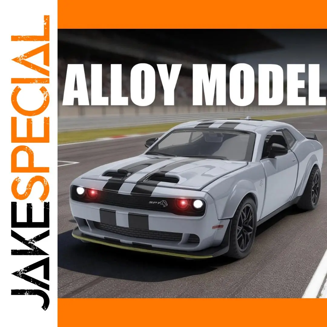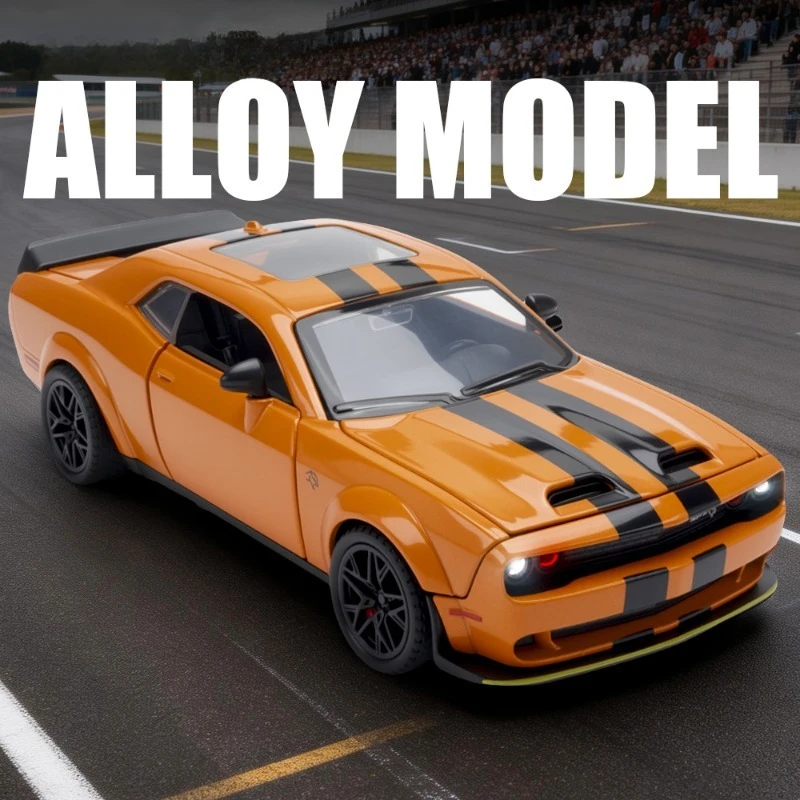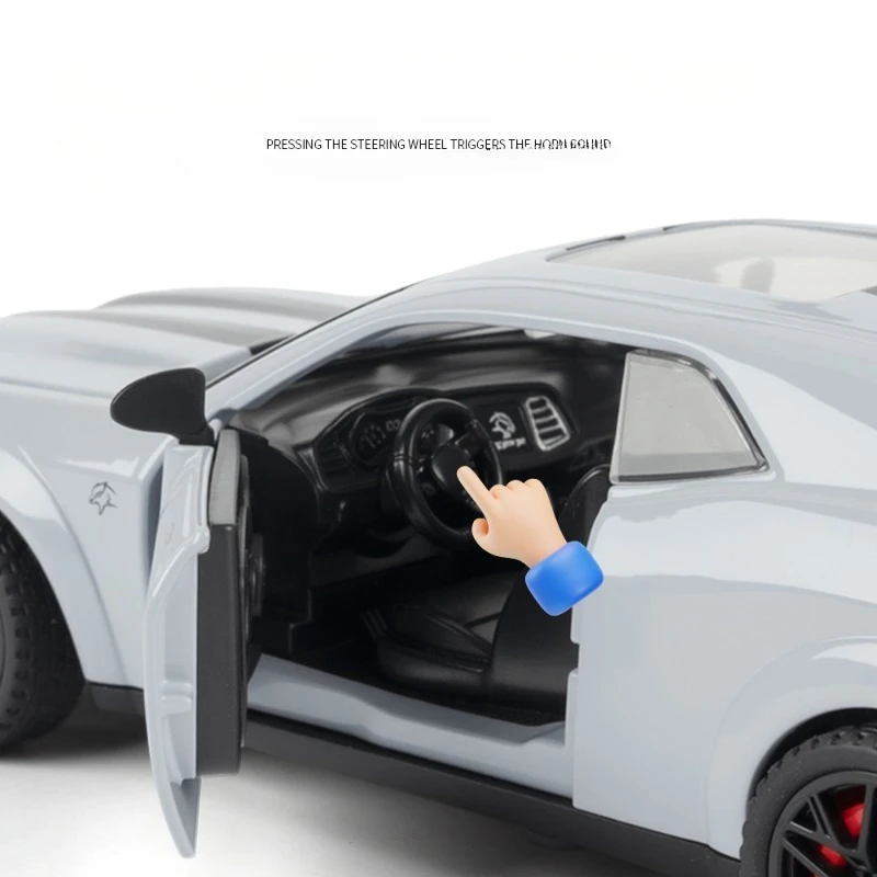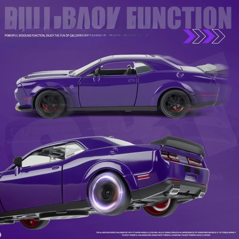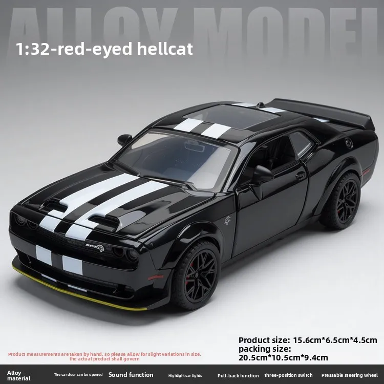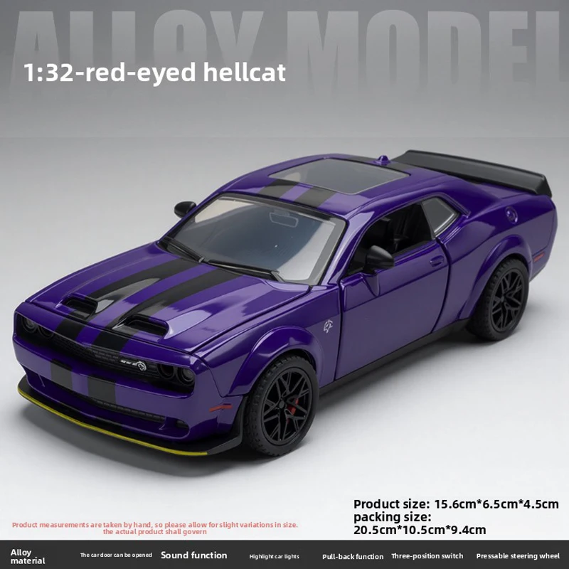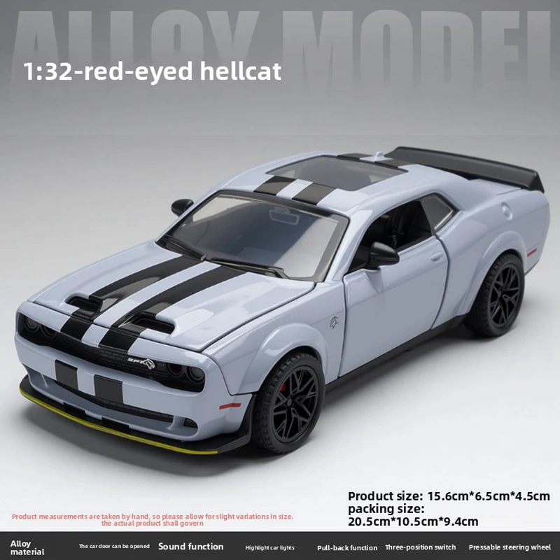 Experience the thrill of the Dodge Charger Hellcat with this highly detailed 1:32 scale diecast model from WELLY. Crafted from durable metal alloy, this realistic miniature features sleek aerodynamic lines, striking black racing stripes on a light grey body, and performance-inspired details such as a functional hood scoop, black multi-spoke rims, and an aggressive front grille with illuminated red headlight accents. Equipped with sound and light features, it brings your collection to life. Available in several vibrant colors, including black, purple, grey, and orange, with options to suit your display. This model is perfect for adult collectors and enthusiasts seeking authenticity and craftsmanship.