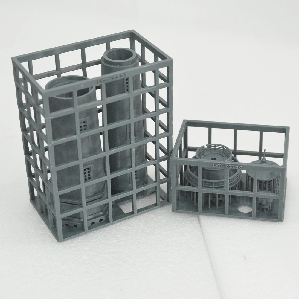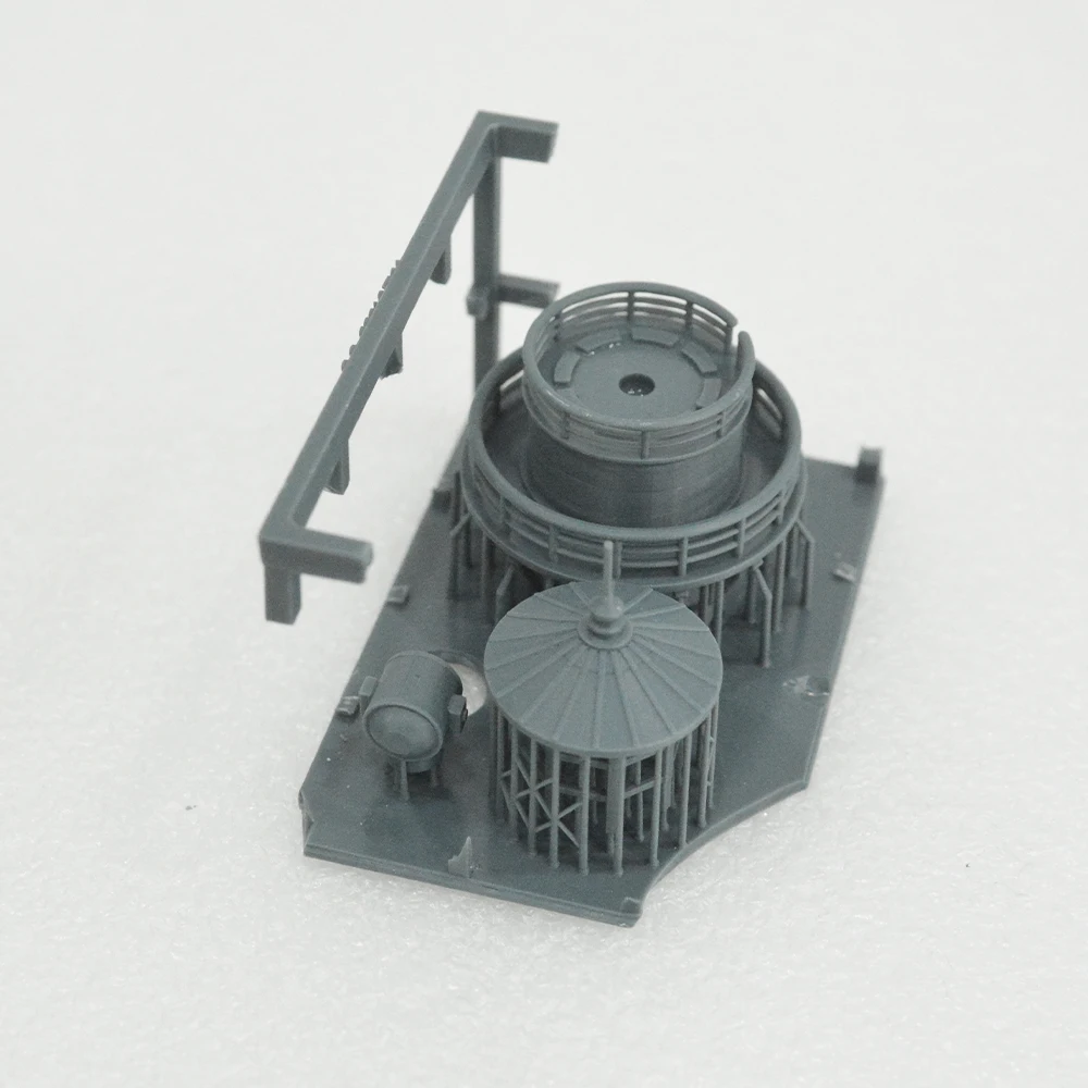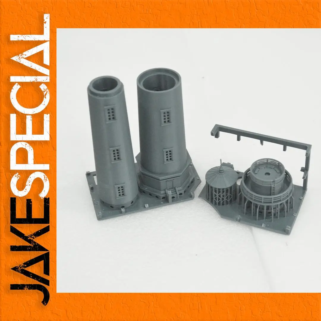 This exquisite miniature factory building set includes two beautifully sculpted, grey cylindrical structures resembling smokestacks or silos, which enhance any diorama or railroad track display. Each tower is detailed with small, evenly spaced windows and has a gently tapered design for an authentic aesthetic. The square base provides stability, while a smaller adjacent round building adds interest with its circular balcony and central core. Made from durable resin, this high-quality model showcases a fine texture and a matte finish, making it ideal for modeling enthusiasts. Versatile across multiple scales (1:87, 1:160, 1:72, and 1:144), it caters to various creative setups, including a luminous option for the 1:87 scale.