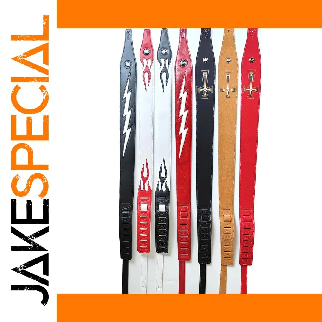 Step into the spotlight with this stunning lightning bolt and flame themed guitar strap. Crafted from soft PU leather with layered construction, it offers durability and comfort for long performances. Its vibrant designs, featuring striking lightning and fiery motifs, immediately catch the eye and add a rebellious touch to your style. The adjustable length, ranging from 125 to 141 cm (48 to 55″) or 130 to 155 cm (51 to 61″), ensures a perfect fit for all guitar types, from electric to acoustic and bass. Reinforced attachment points guarantee a secure connection, while the bold wide design, approximately 6.3 to 6.5 cm wide, combines style with practicality. This strap's textured surface and edgy motifs make it ideal for musicians who want to stand out on stage.