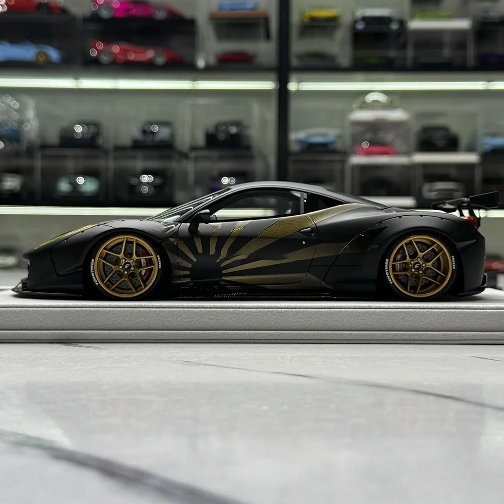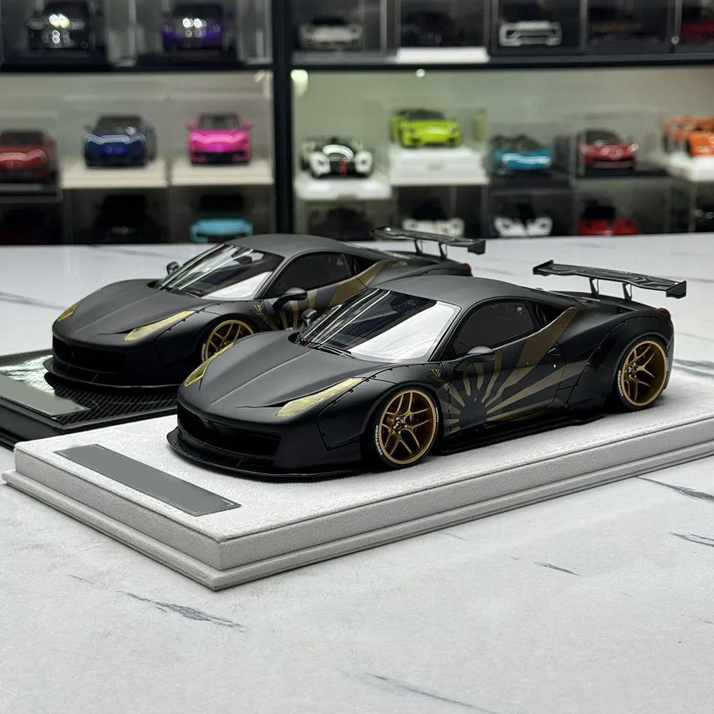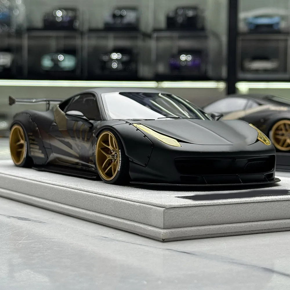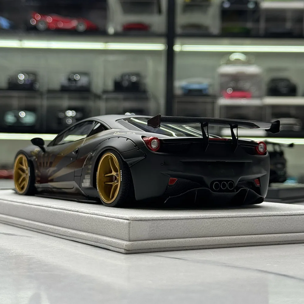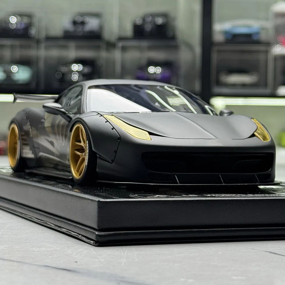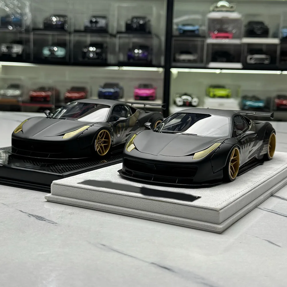 This 1:18 scale resin diecast model of the limited edition 458 GT 1.0 features a sleek, fully enclosed body with a carbon fiber base or white background finish. Designed for static display, it boasts rotatable alloy wheels with a detailed multi-spoke design, sharp angular headlights, and prominent rear spoiler, capturing an aggressive, racing-inspired aesthetic. Crafted with precise, smooth surfaces and aerodynamic details, it’s perfect for collectors aged 14 and above seeking a high-quality decorative ornament or gift. Made from durable resin, this model offers an authentic and sophisticated representation of the iconic sports car without electrical components or movable parts beyond the rotating wheels.