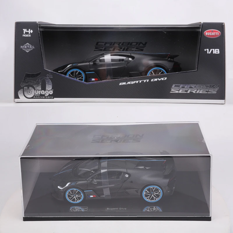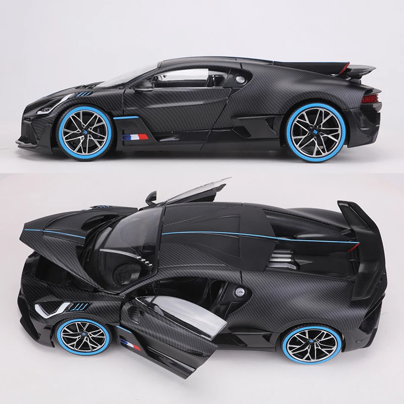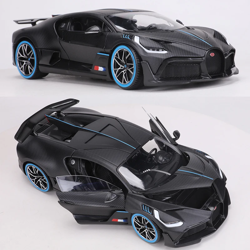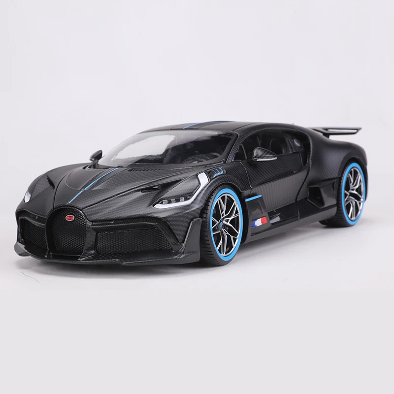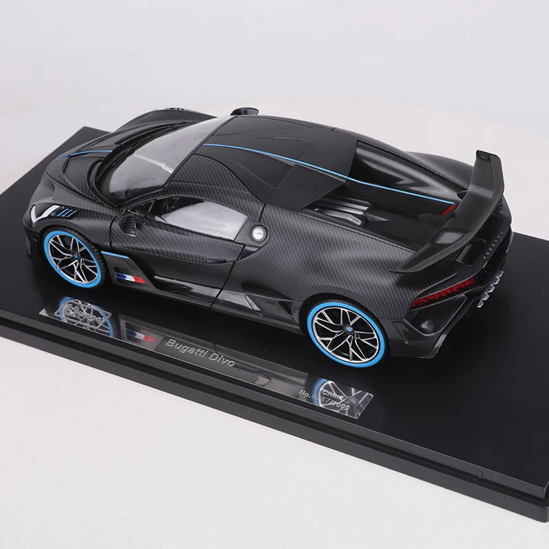 Experience the thrill of owning a meticulously crafted 1:18 scale diecast replica of the iconic Bugatti Divo by Burago. This limited edition piece, numbered among only 1,000 units, captures the essence of this high-performance supercar with stunning realism. Its sleek, glossy black finish is complemented by embossed textured carbon fiber patterns across the body, giving it a sophisticated, tech-inspired look. Striking blue accents run along the centerlines of the hood, roof, and rear wing, creating a bold contrast. The transparent windows reveal intricate interior details, while the front grille and headlights showcase remarkable craftsmanship. This model’s aerodynamic contours and multi-spoke wheels edged with vibrant blue lines truly embody the spirit of a racing masterpiece. It’s a collector’s dream that promises to impress.