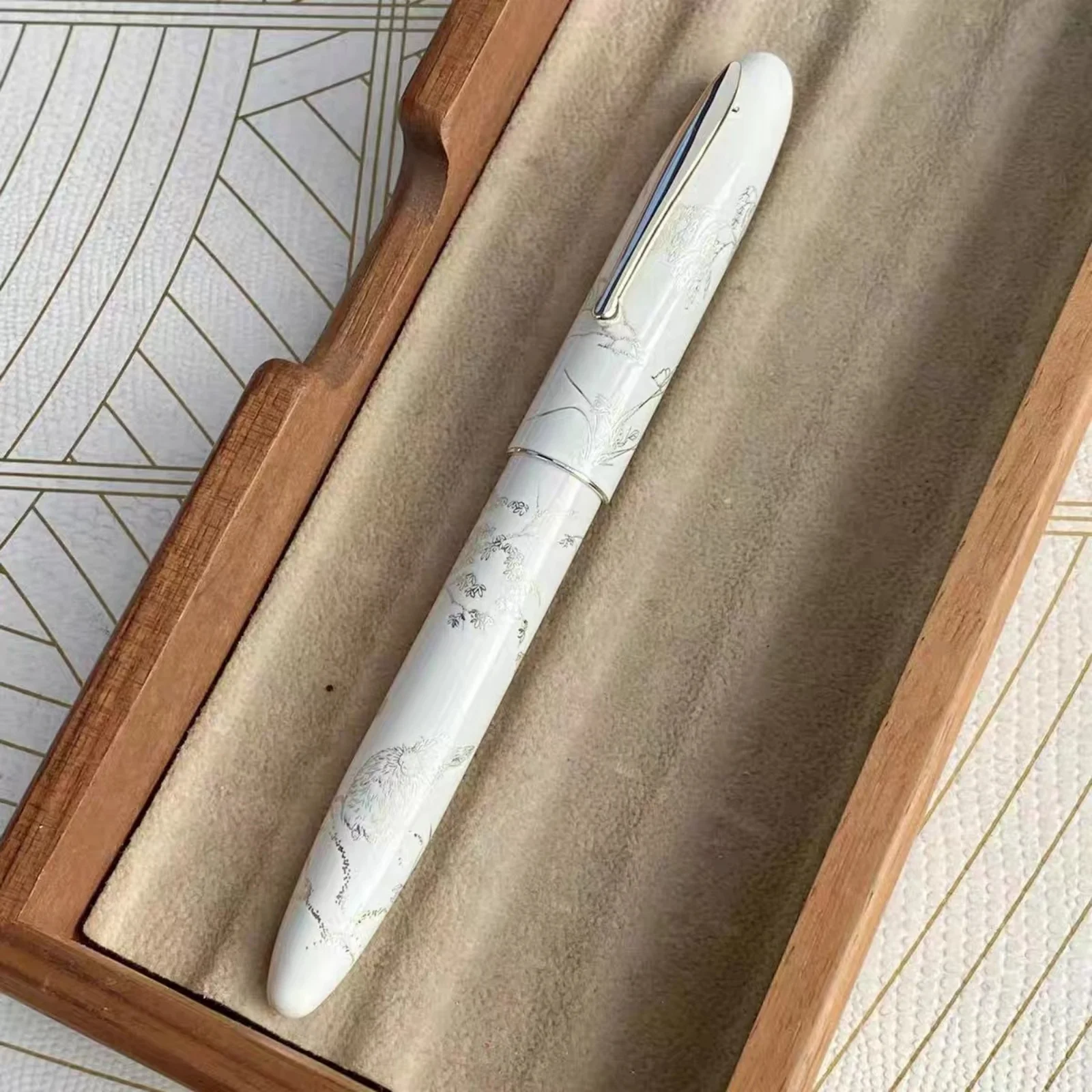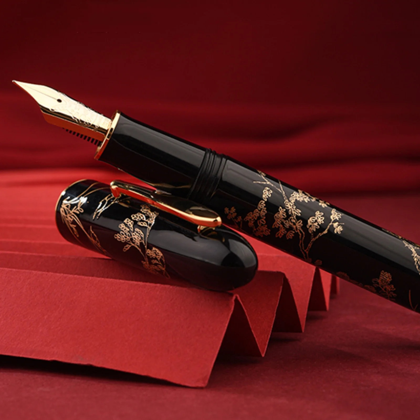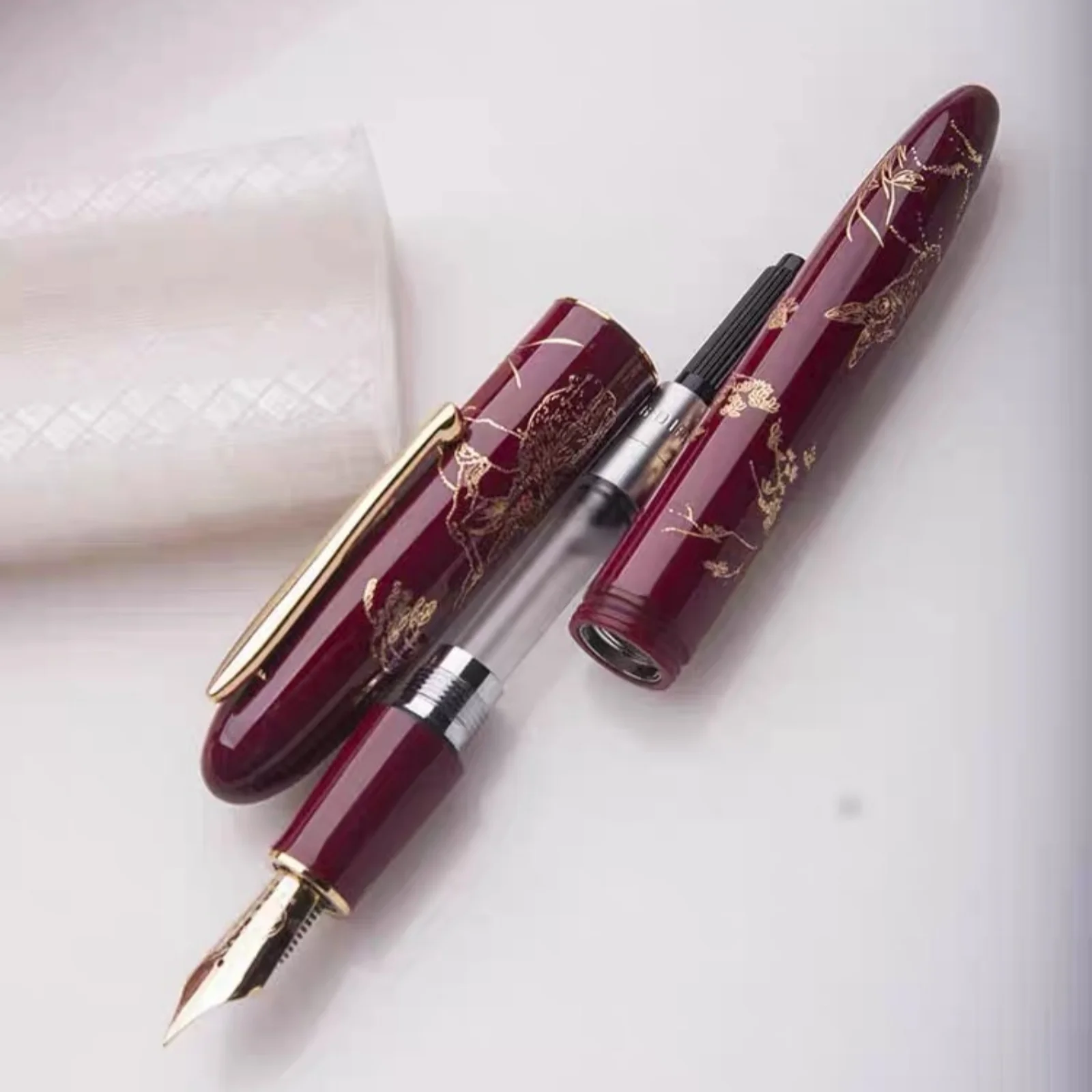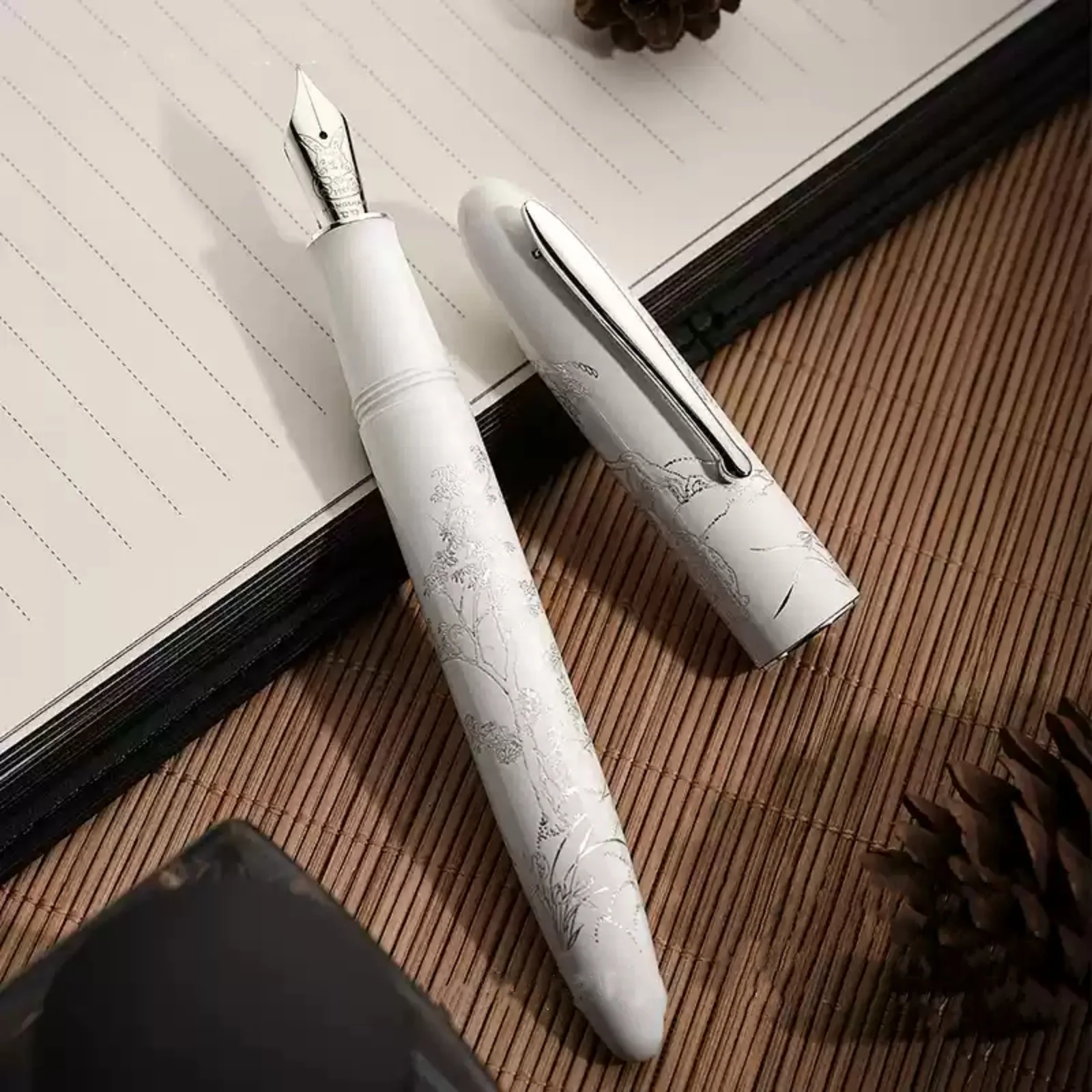Experience the elegance of our limited edition Hongdian N23 fountain pen, model H0024-N23, featuring a sleek metal construction and a high-quality IRAURITA nib with a precise EF (extra fine) tip size. Available in four vibrant colors—white, black, blue, and red—each pen is adorned with intricate metallic engravings inspired by traditional Asian motifs, contrasting beautifully against its glossy finish. The pens are capped with matching metallic clips for added sophistication. Perfect for writing enthusiasts, collectors, and gift-givers, this beautifully crafted pen combines traditional artistry with modern refinement, offering a luxurious addition to any collection or special occasion.