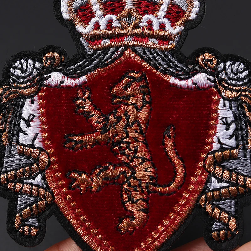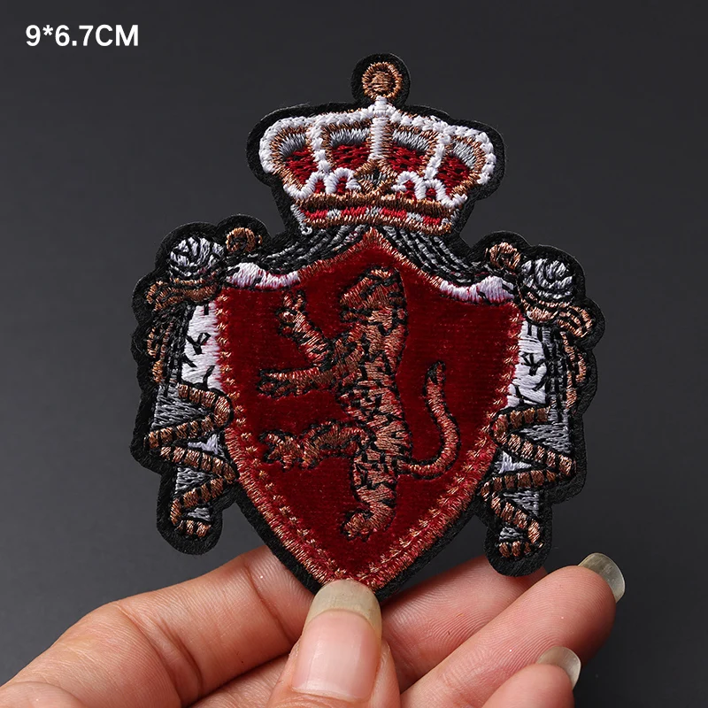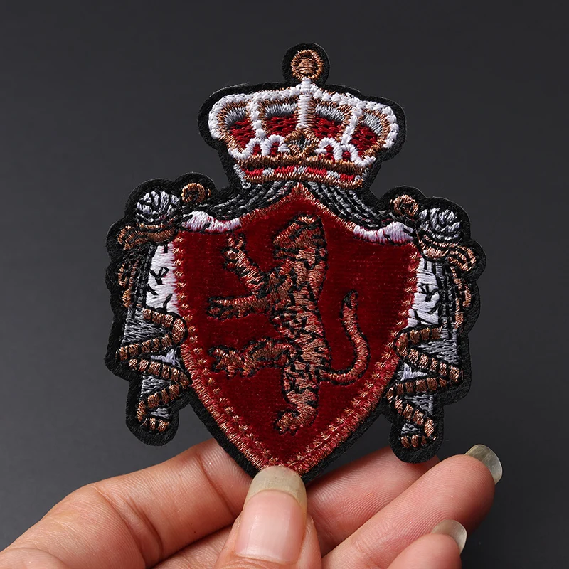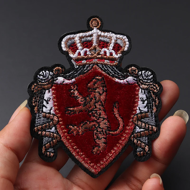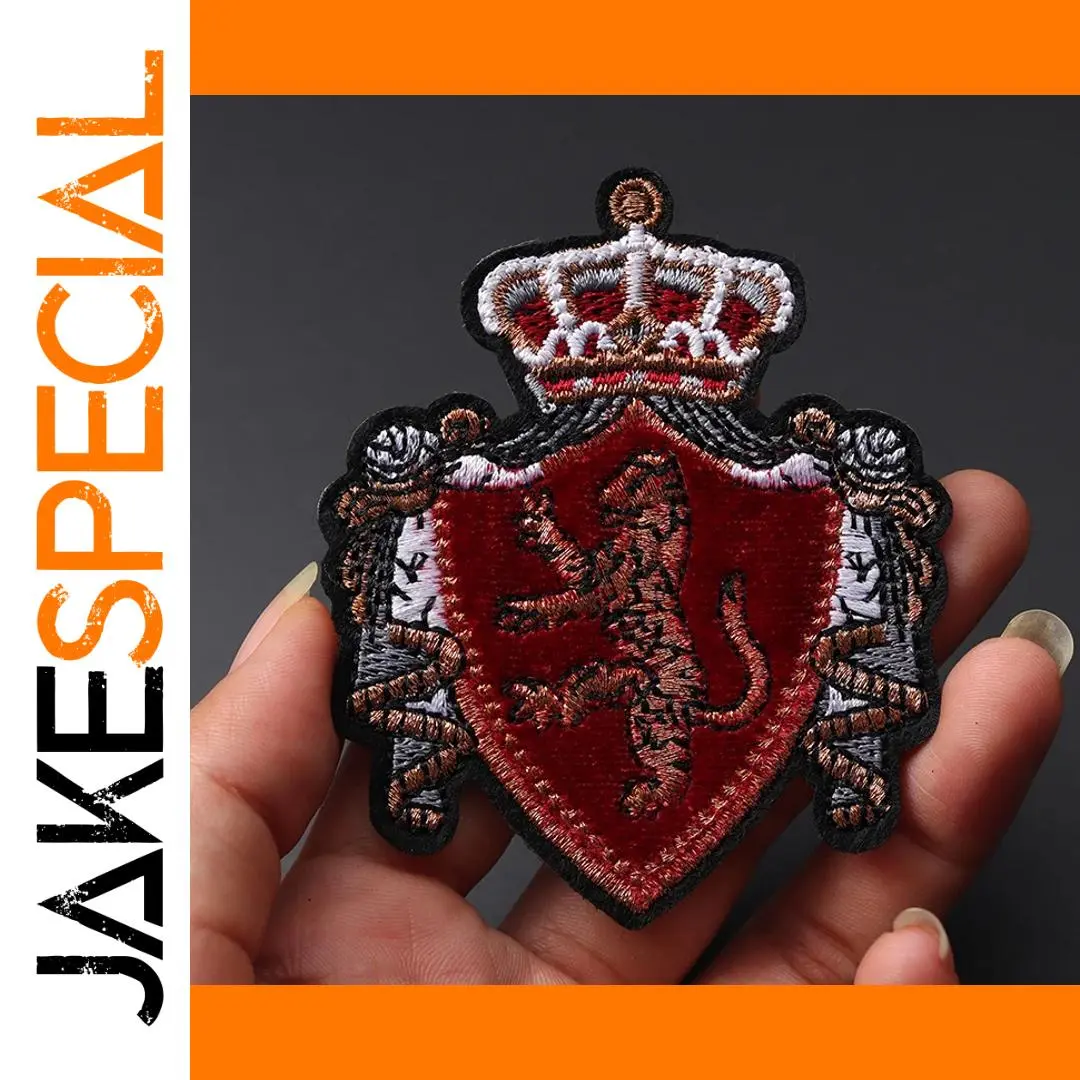 Transform your clothing with this stunning Lion Crown embroidered iron-on patch that measures approximately 9×6.7 cm. The vivid red background pairs beautifully with a dynamic portrayal of a dark-shaded lion, exuding strength and royalty. A crown in rich gold, white, and red sits atop the lion, reinforcing the classic and regal theme of the patch. Edged with a durable black border and accentuated with elegant scrollwork, this patch not only adds charm but also embodies a nostalgic style. Crafted from high-quality non-woven fabric, it's perfect for either sewing or ironing onto your favorite garments, allowing you to express your unique style effortlessly.