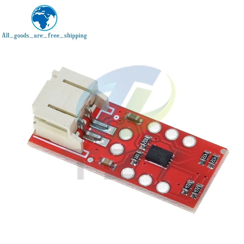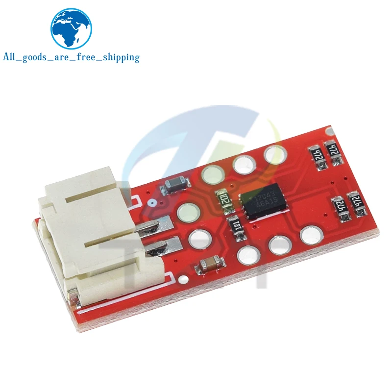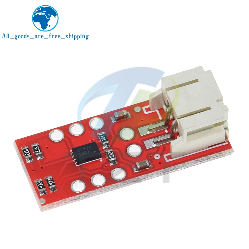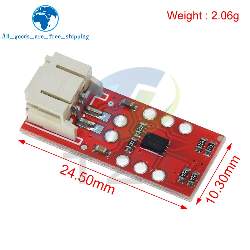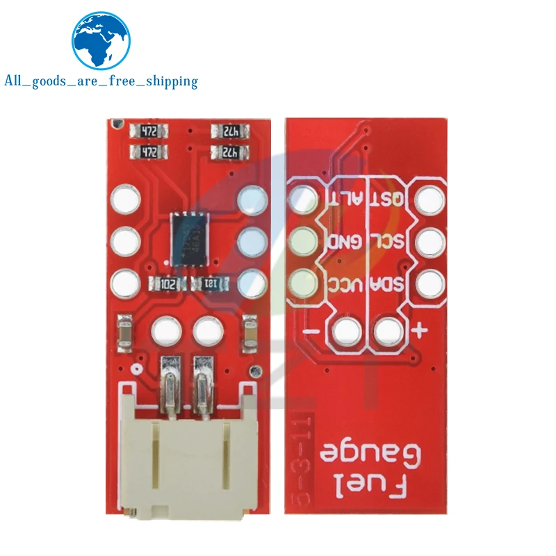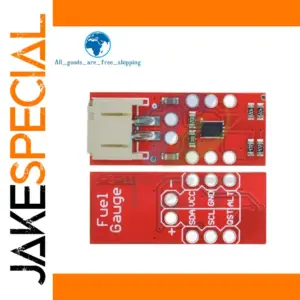 This lithium battery detection module, based on the MAX17043 chip, features precise A/D conversion via an I2C interface and is ideal for LiPo fuel gauging. Designed with a vibrant red PCB and compact rectangular shape, it includes surface-mount resistors, capacitors, and a black integrated circuit marked “17043” for accurate voltage monitoring. The module features six through-holes with labeled pinouts (+, SDA, SCL, GND, VCC, A0) for easy integration into electronic projects. Available in packs of 1 or 2 pieces, this high-quality, non-chemical module is perfect for enthusiasts and professionals seeking reliable LiPo battery management with a sleek, modern aesthetic.