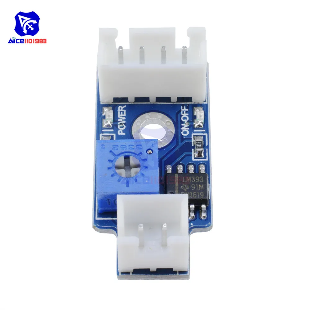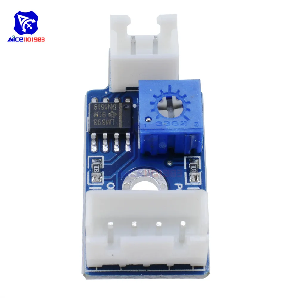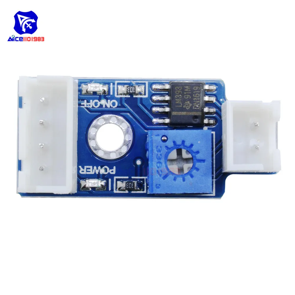 This compact LM393 Comparator Module operates at 3.3V to 5V with a size of 29.5mm x 13.5mm, featuring two input interfaces compatible with resistive sensors such as photoresistors and thermistors. It includes an internal adjustable voltage comparator, a 10kΩ pull-down resistor, and provides both analog output for voltage signals and a digital output for threshold-based logic. When the positive input voltage exceeds the negative, the digital output switches to high (1), otherwise low (0). Its sleek blue PCB with silkscreen labels, transparent “POWER” component, and precise component placement offer a modern, organized aesthetic suitable for various sensor applications in a wide temperature range of -10°C to 65°C.