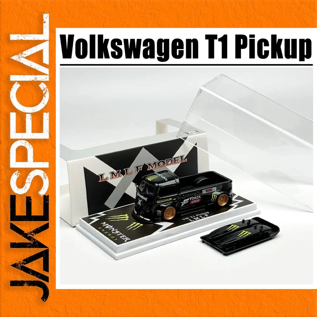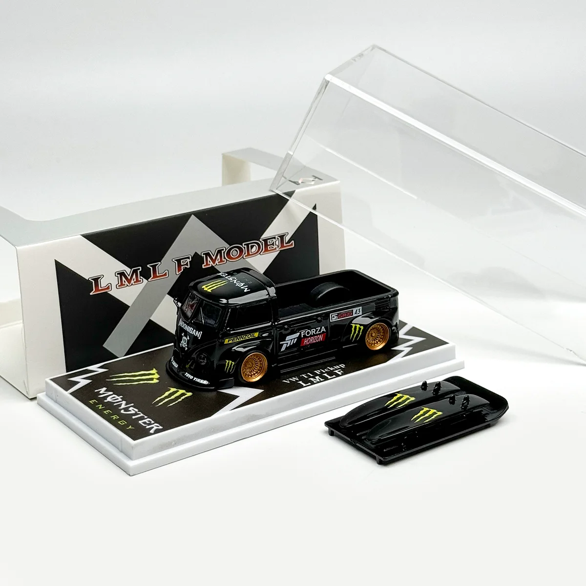 The LMLF 1/64 Volkswagen T1 Pickup is a stunning diecast metal model, expertly crafted for adult collectors. Finished in sleek black, it features a classic Volkswagen grille and headlights for an authentic look. Bold bright green “Monster” logos and “FORZA” text enhance its sporty appeal, while the contrasting gold wheels accentuate its design. The model includes a display base designed in white and black with “LMLF MODEL” inscribed, and a clear plastic cover for protection and visibility. A detachable hood or cover, also in black with branding, maintains design consistency. Meticulously detailed, this model is a perfect addition to any collection.