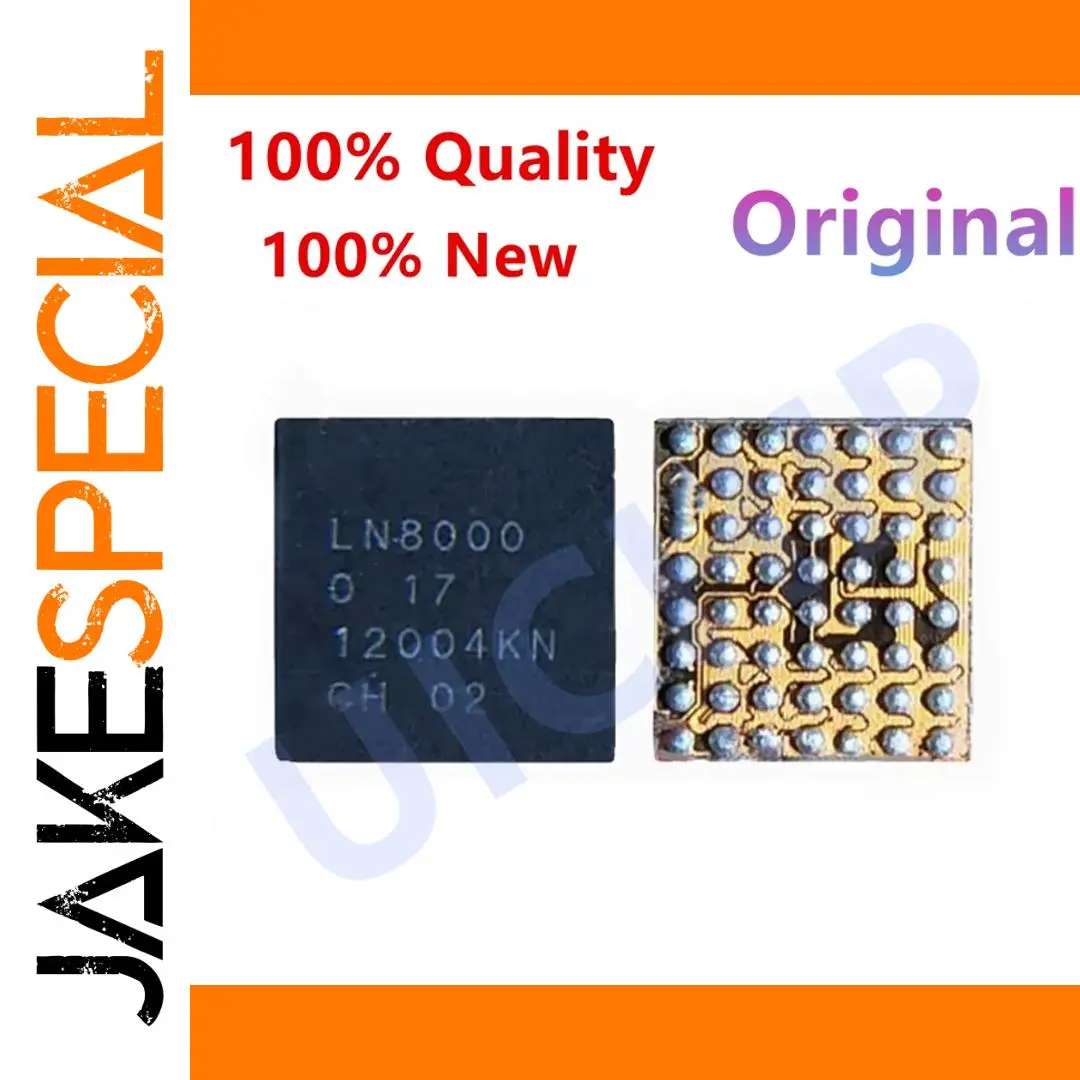 Enhance your electronic projects with this set of two new LN8000 integrated circuit charger IC chips, featuring a sleek BGA package design. These drive ICs operate within standard voltage and power dissipation parameters, ensuring reliable performance. Each chip showcases a high-quality black square-shaped body with precise white markings for easy identification, and the underside displays a grid of shiny solder balls and intricate copper traces, highlighting craftsmanship and technical sophistication. Ideal for computer applications and customizable to fit various electronic devices, these ICs are perfect for professionals seeking dependable, high-performance components to optimize their circuitry and ensure seamless operation.
