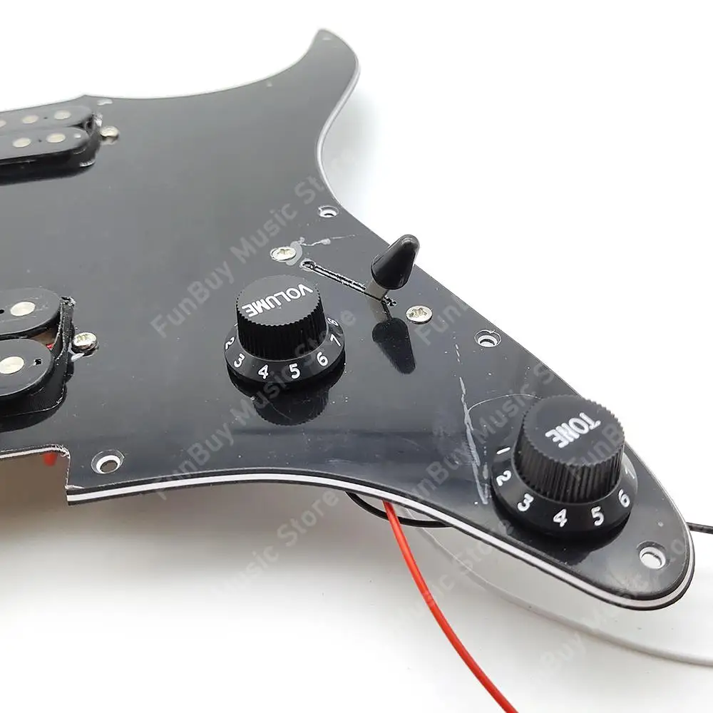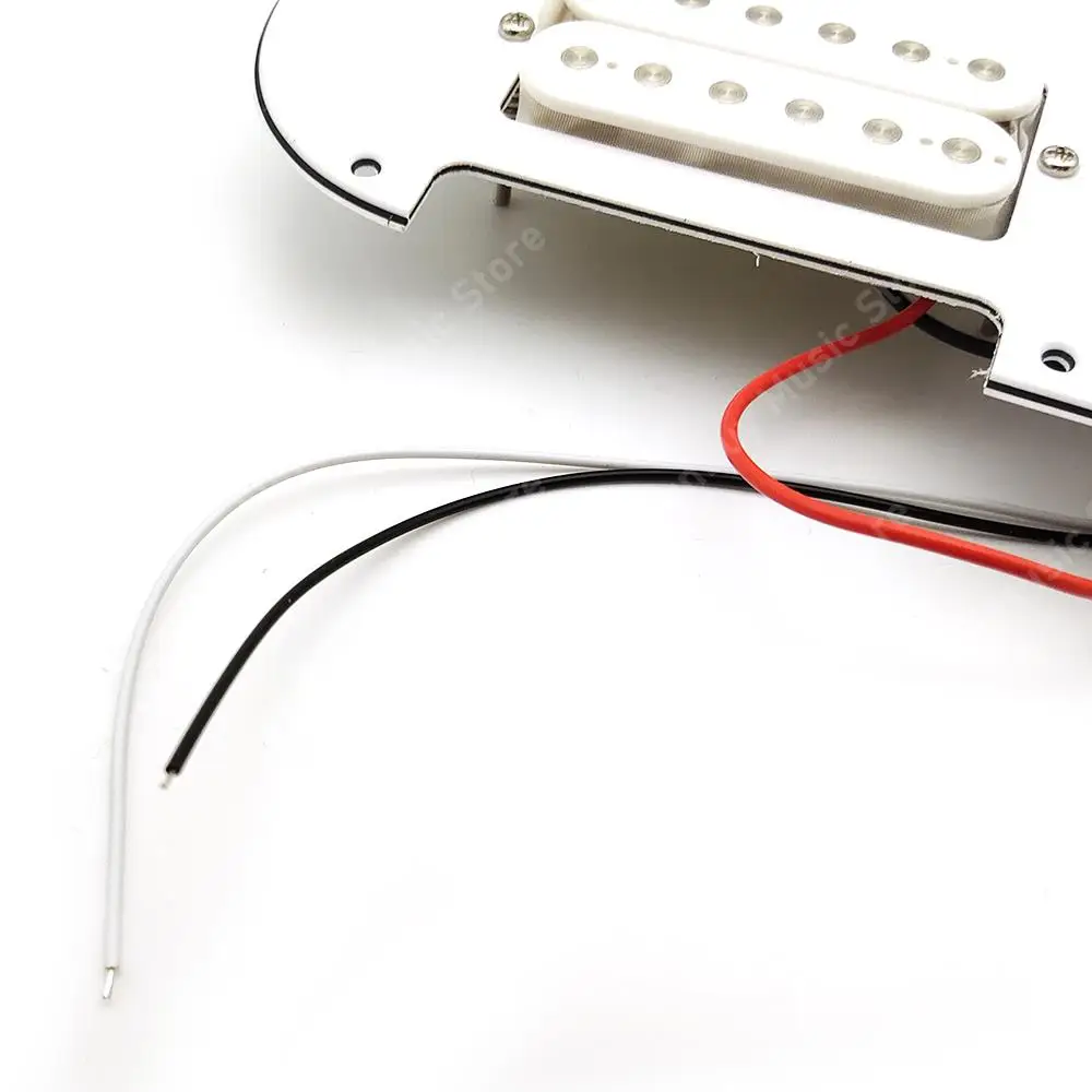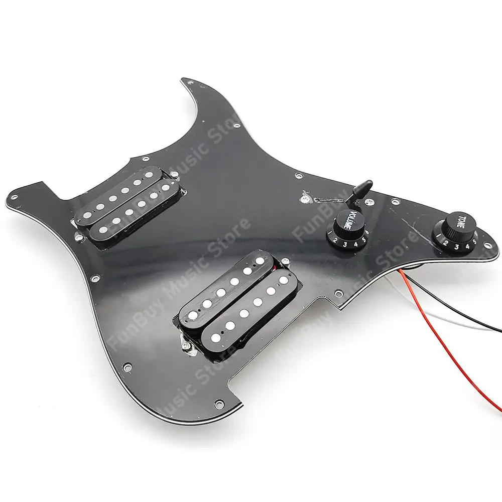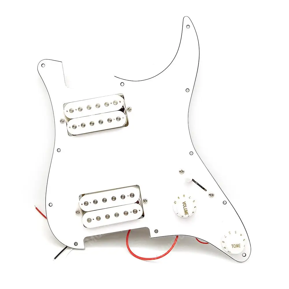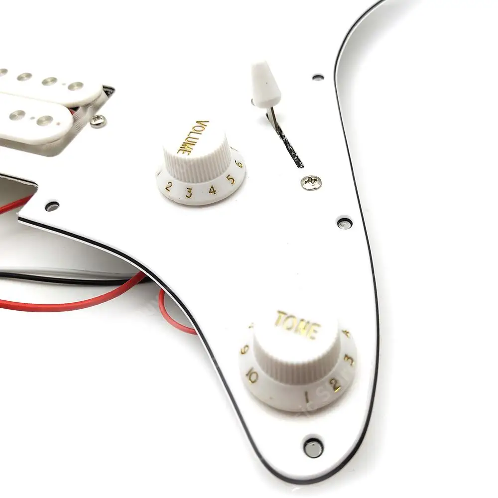 Enhance your ST-style electric guitar with this premium three-set loaded prewired HH pickguard assembly, featuring a sleek black or white 3-ply design with a glossy finish. Equipped with two ceramic humbucker pickups measuring approximately 52mm x 52mm and a DC resistance of 9 ohms, it offers powerful, rich sound. The set includes a 3-way toggle switch, volume and tone pots, a neatly wired 4-conductor harness, and matching black or white control knobs, all assembled with high-quality metal and plastic components. Ready for easy installation, this ROHS-certified upgrade ensures a professional look and enhanced tonal performance for your guitar.