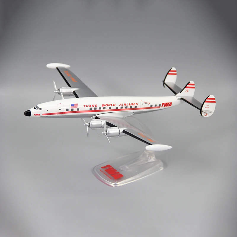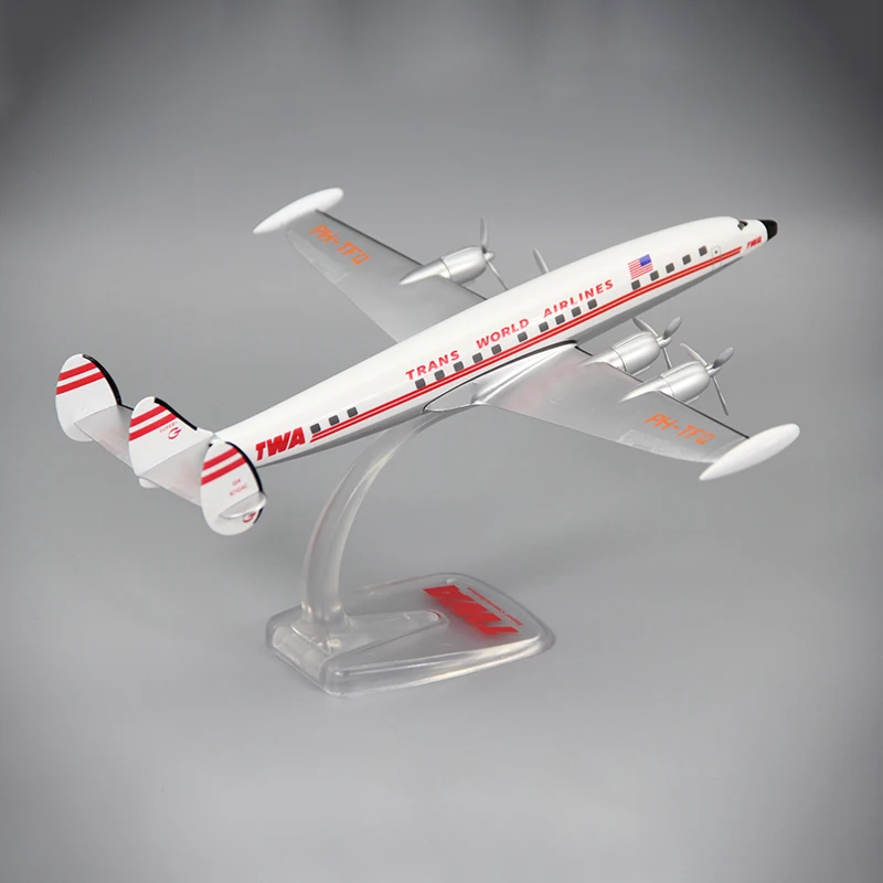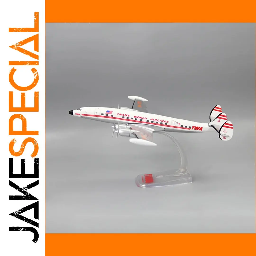 Experience the elegance of vintage aviation with this highly detailed 1:125 scale model of the Lockheed L-1049. Measuring approximately 29 centimeters in length, this replica captures the iconic design of the classic aircraft, featuring a crisp white fuselage accented by a striking red stripe along its side, complemented by the distinctive red and white striped tail fin. The twin silver engines under the wings add a metallic touch, while fine details like windows, doors, panel lines, and cockpit windows enhance realism. Crafted from durable ABS plastic, it offers a captivating display piece perfect for collectors, offices, or decorative spaces. Please note, it requires self-assembly and has a slightly textured paint finish, adding authenticity to its vintage charm.