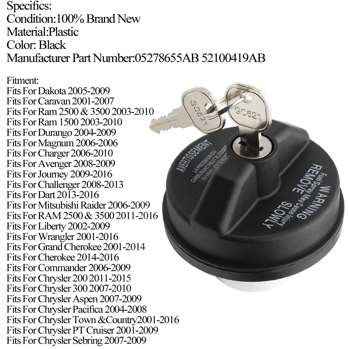 - Designed to fit vehicles from 2001 to 2021, including Jeep, Dodge, Chrysler, Fiat, and Ram models with OEM number 05278655AB / 52786555AB.